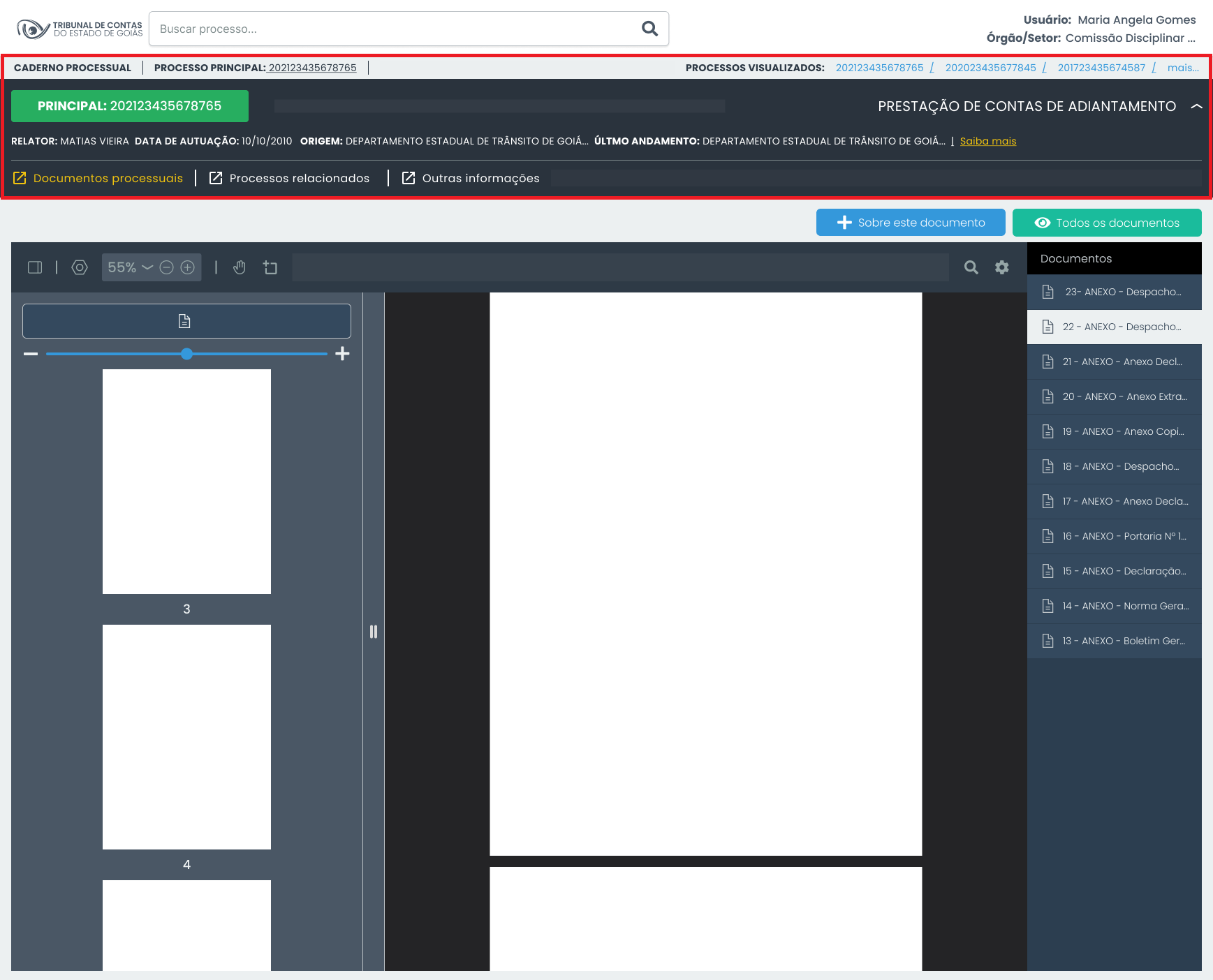 * Ao clicar no processo, o Sistema fecha o modal e exibe o processo acionado.
