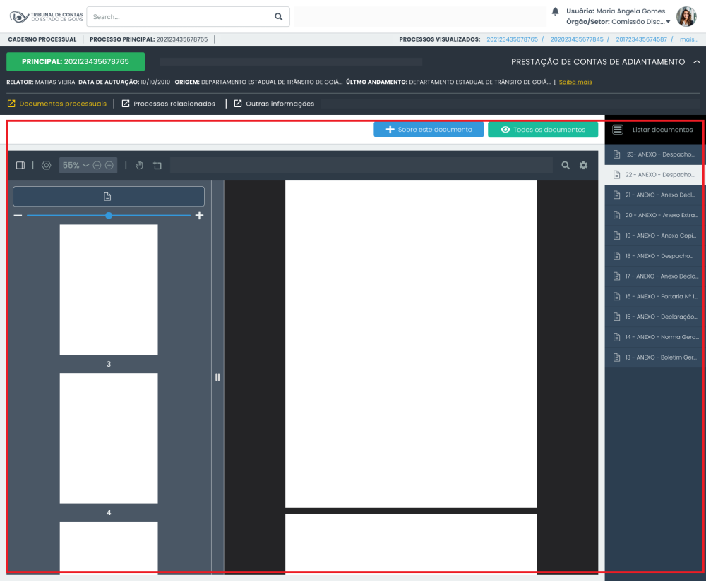 | 02 | O Sistema exibe, em um modal, as informações de todos os documentos listados e foram incluídos ao processo que está sendo detalhado. | RN05 | Tela 03 |