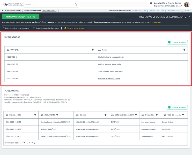 | Interessados | Tabela | Exibe os interessados vinculados ao processo detalhado, apresenta as informações organizadas nas colunas: CPF/CNPJ e Nome. |