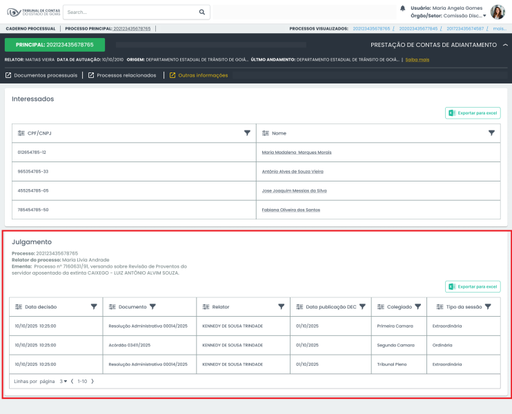 | 03.2 | Caso o Usuário acione a opção para exportar para excel, o Sistema exporta todos os julgamentos existentes, para o processo consultado. |