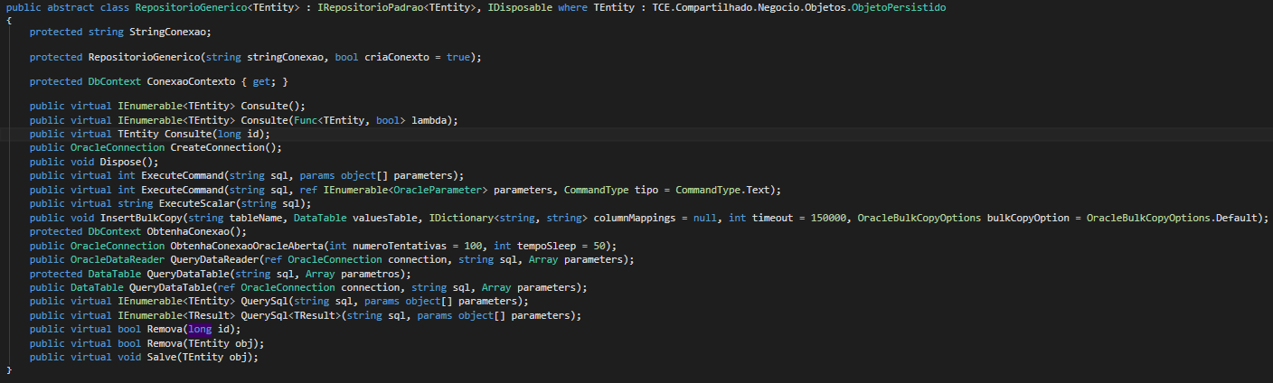As classes do Repositório são as responsáveis pela implementação das funções especificadas nas Interfaces. Porém a as funções básicas de um repositório já estão desenvolvidas, então o que se espera para esta classe é a criação de funções especificadas ou a subscrita(override) dos métodos existentes. Os métodos padrões pertencem a classe genérica RepositorioGenerico que dever ser tipada por um objeto de negocio. Veja a figura da classe que deve herdar RepositorioGenerico e implementar a interface e respectivamente a classe RepositorioGenerico.