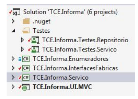 ● Camada de Testes: o nome dos projetos de teste deve conter antes do nome da camada a qual será testada o prefixo “Testes”. Por padrão, os projetos de teste inicialmente serão dois, os de teste da camada de repositório e o da camada de serviço. Não obstante a isso, caso o produto de software realize integração com produtos de terceiros, nesse projeto terá outro projeto de testes cujo sufixo será “Integracao” (Integração), que será responsável por verificar as chamadas integradas dos serviços do projeto do TCE com os serviços de terceiros. Para projetos que vierem a ter teste de UI automatizado, o projeto de testes deverá respeitar o mesmo padrão de nomenclatura, por exemplo para o projeto TCE.Informa, o nome seria “TCE.Informa.Testes.UI.MVC”. Os projetos de teste de repositório deverá sempre testar a comunicação e operações reais com o banco de dados em ambiente de homologação. Já os projetos de testes de serviço, poderá mocar o repositório e outras estruturas de dados ou serviços que fogem da competência da equipe da GER-TI garantir a funcionalidade. A API de moque de objetos utilizadas pelo TCE-GO, será o RhinoMocks.