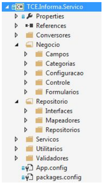 O projeto TCE.Compartilhado foi desenvolvido na primeira versão da proposta de arquitetura dos softwares do TCE-GO. Essa versão diferente da proposta desse documento, os pacotes Negócio, Repositório e Serviço eram projetos separados. Na proposta desse documento, esses três projetos são organizados em um único projeto, e suas estruturas são organizadas em pacotes separados com os nomes do que antes eram projetos, pacotes de Negócio, Repositório e Serviços, como podemos visualizar na Figura 7 e na Figura 9.