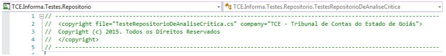 ● Estilo de código - o padrão de estilo de código utilizado nos projetos será o padrão determinado pela Microsoft, com alterações definidas pelas estruturas de Style Cop adotadas pela equipe de desenvolvimento da GER-TI. Todo arquivo de classe de projeto deve ter o cabeçalho contendo a propriedade intelectual do TCE-GO, como apresentado na imagem abaixo.