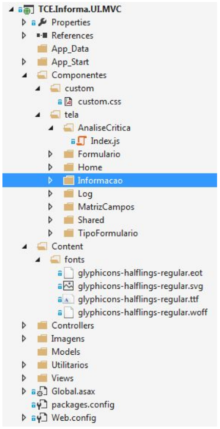 ● Camada UI: todos os projeto UI, independente do tipo Web, Desktop ou Console terão o identificado no nome do projeto que identifica que o projeto é UI e qual o padrão utilizado, por exemplo: se for um projeto UI Web MVC, utilizando o produto Informa, o nome do projeto será “TCE.Informa.UI.MVC”. Se o produto Informa tiver uma interface UI Desktop, o nome do projeto seria “TCE.Informa.UI.Desk”. E se tivesse uma interface Console Application, o nome do projeto seria “TCE.Informa.UI.Console”. Os projetos UI Web seguindo o modelo MVC, devem respeitar a organização estrutural apresentada na figura abaixo.