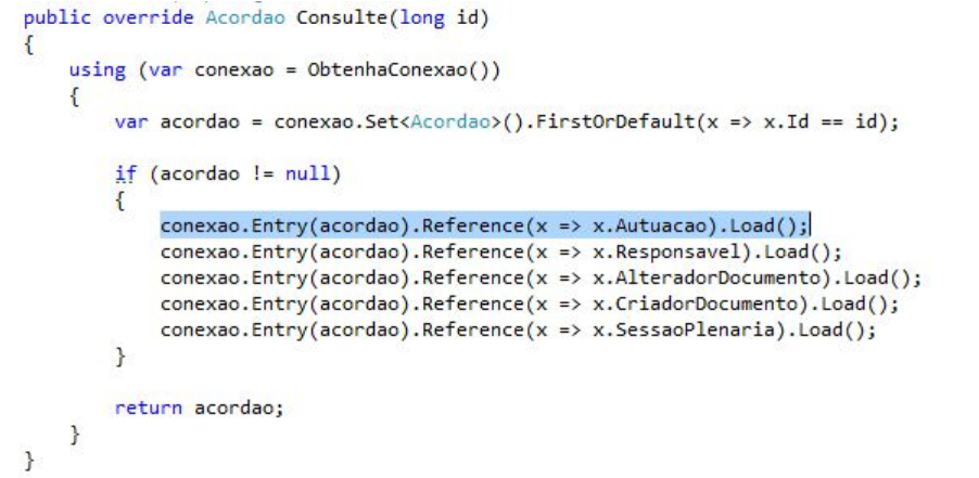 O pacote de negócio contem as classes que representam os objetos do negócio da solução de software. Esses objetos são manipulados pelas camadas de repositório (se forem objetos persistidos) e pela camada de serviço. Esses objetos são completos, com todos os atributos de negócio, logo não tem a restrição quanto ao controle de acesso, visto que o controle de acesso é realizado pela camada de serviço, na consulta e operações da UI ou de outros serviços. As propriedades que representam entidades de classes persistidas não devem ser criadas como sendo do tipo “virtual”, devido o Entity Framework por padrão realizar a carga no relacionamento quando não definido como No Lazy Load. Para que as consultas no banco de dados não carreguem informações desnecessárias, a consulta em que o objeto possui relacionamento com outras entidades, caso o desenvolvedor deseje que o repositório carregue a instância correspondente no relacionamento, este deverá fazer na função de consulta personalizada ou sobrescrever a consulta padrão que deseja carregar o objeto relacionado. Para isso a consulta deverá carregar o objeto dando um Include, na referencia ou fazer um Load após a consulta, sendo o primeiro uma função na referencia da entidade através da expressão lamda (System.Data.Entity), e o segundo uma função do Entity Framework, como apresentado abaixo: