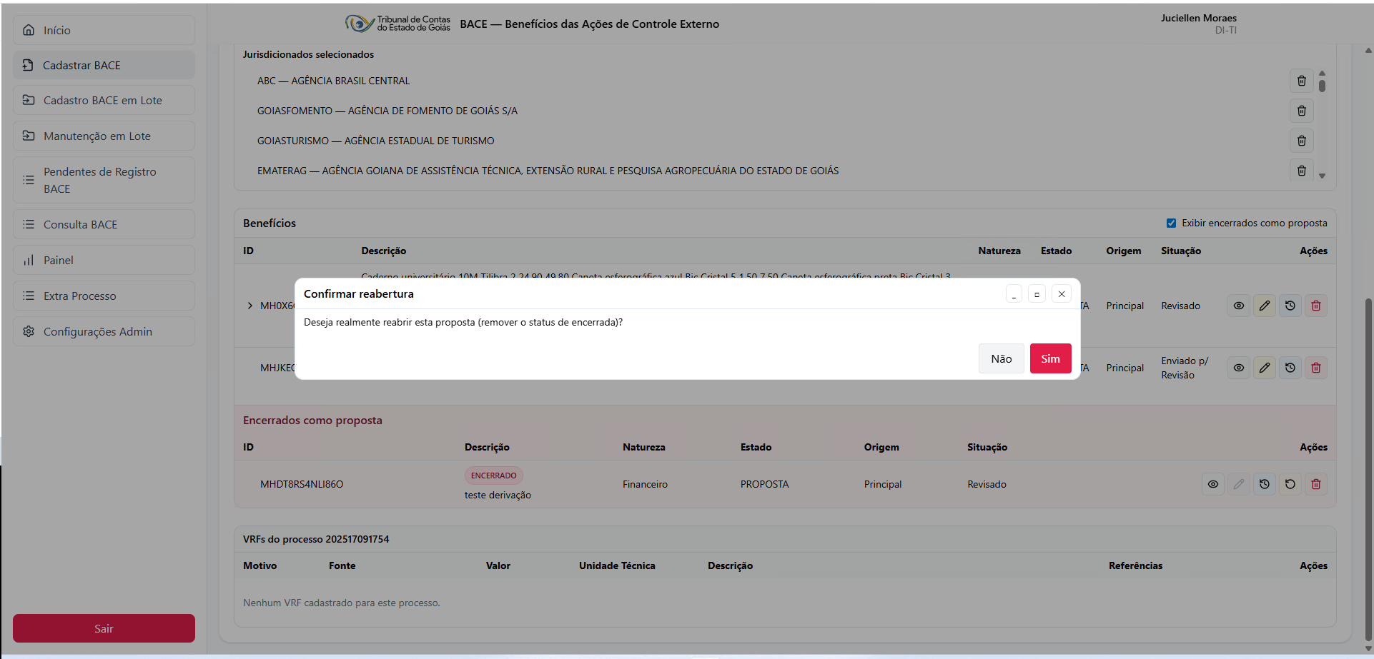 A modal Encerrar Proposta sem Prosseguir é utilizada para finalizar um benefício em estado PROPOSTA, registrando formalmente que ele não seguirá como benefício Potencial. Já a funcionalidade Reabrir Proposta é usada para desfazer um encerramento, permitindo que o benefício volte ao fluxo normal de edição, revisão e evolução de estado.