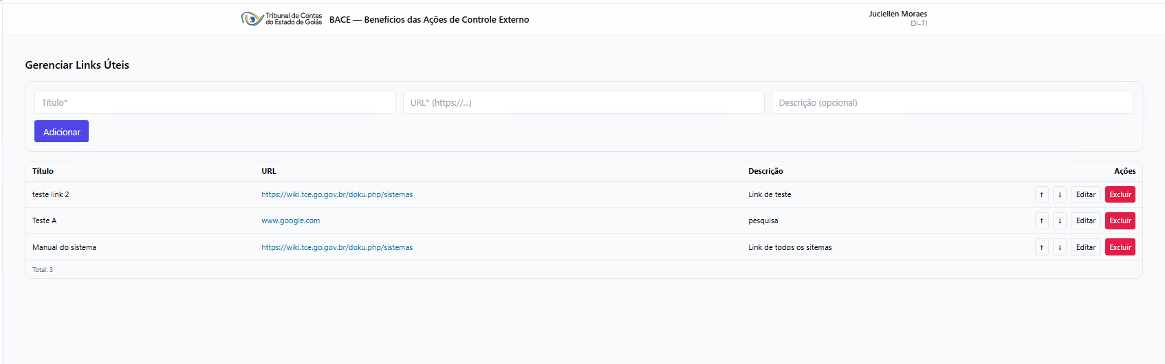 Links Úteis – inclusão, ordenação, edição e exclusão de links exibidos na Home do sistema.