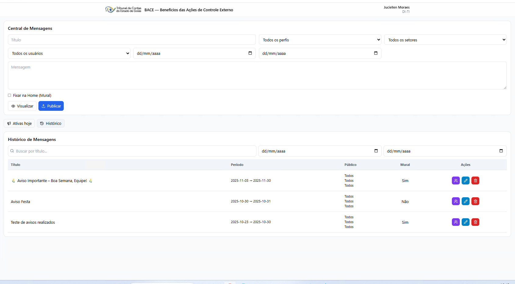 Central de Mensagens – publicação, revisão, edição e exclusão de avisos exibidos no painel inicial dos usuários.