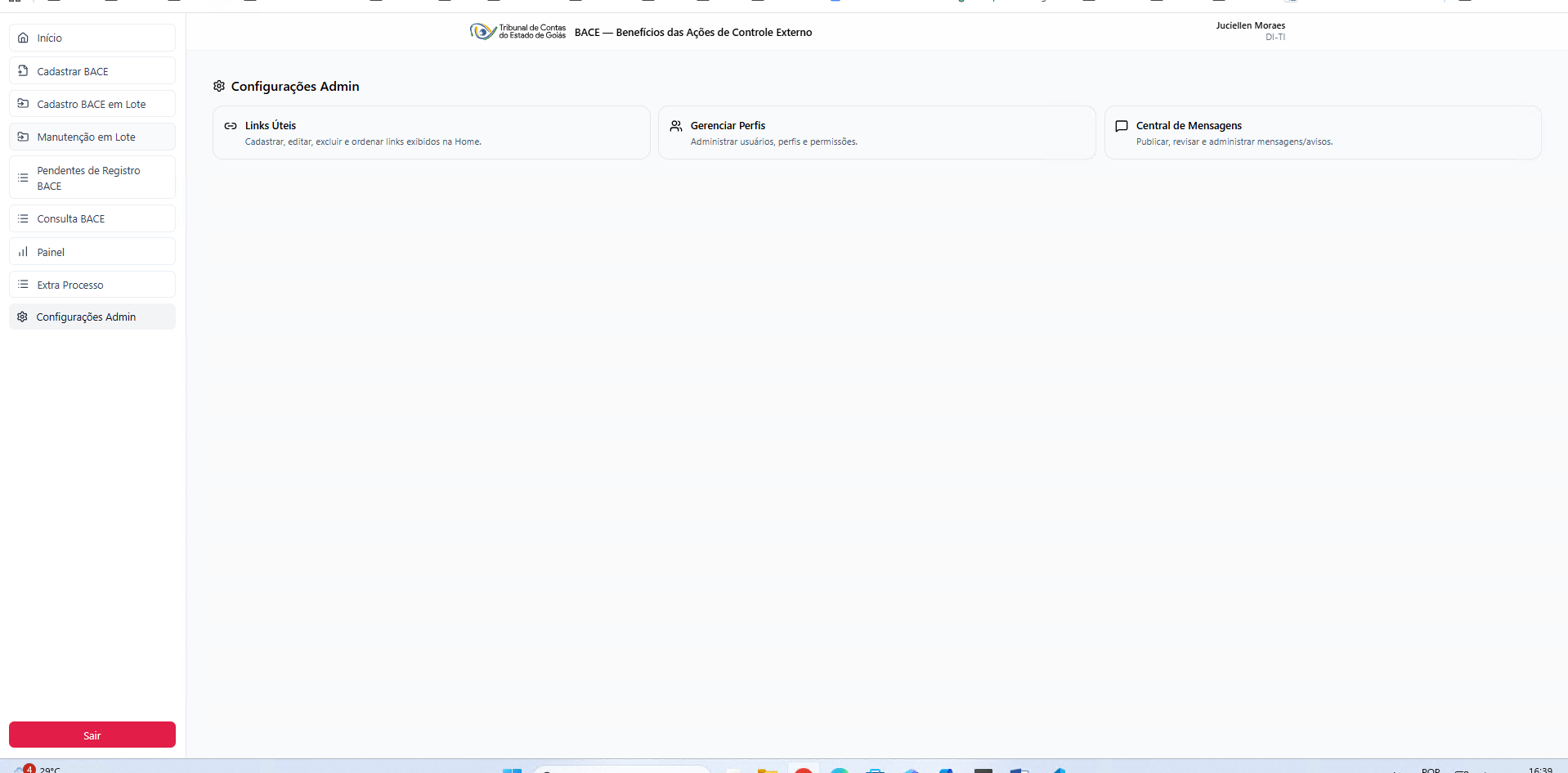 O módulo Configurações Admin concentra as funcionalidades destinadas exclusivamente aos Administradores do BACE, permitindo gerenciar links exibidos na Home, perfis de usuários e avisos institucionais publicados na Central de Mensagens.