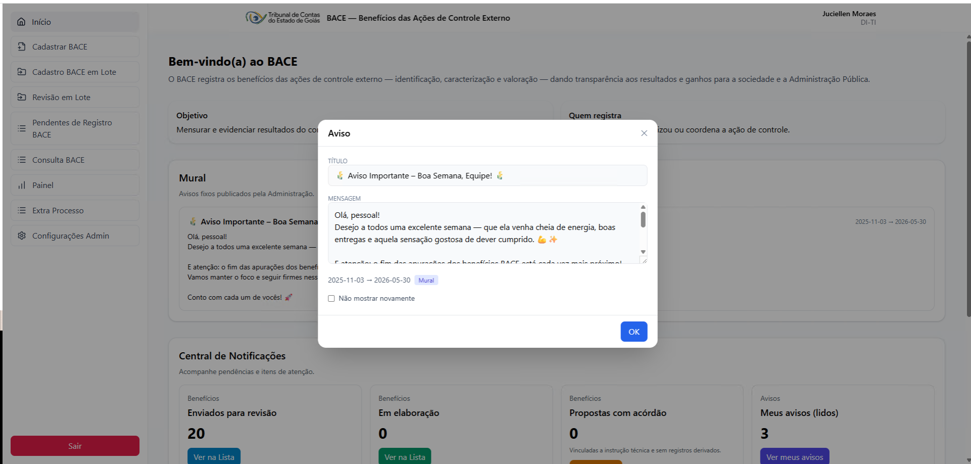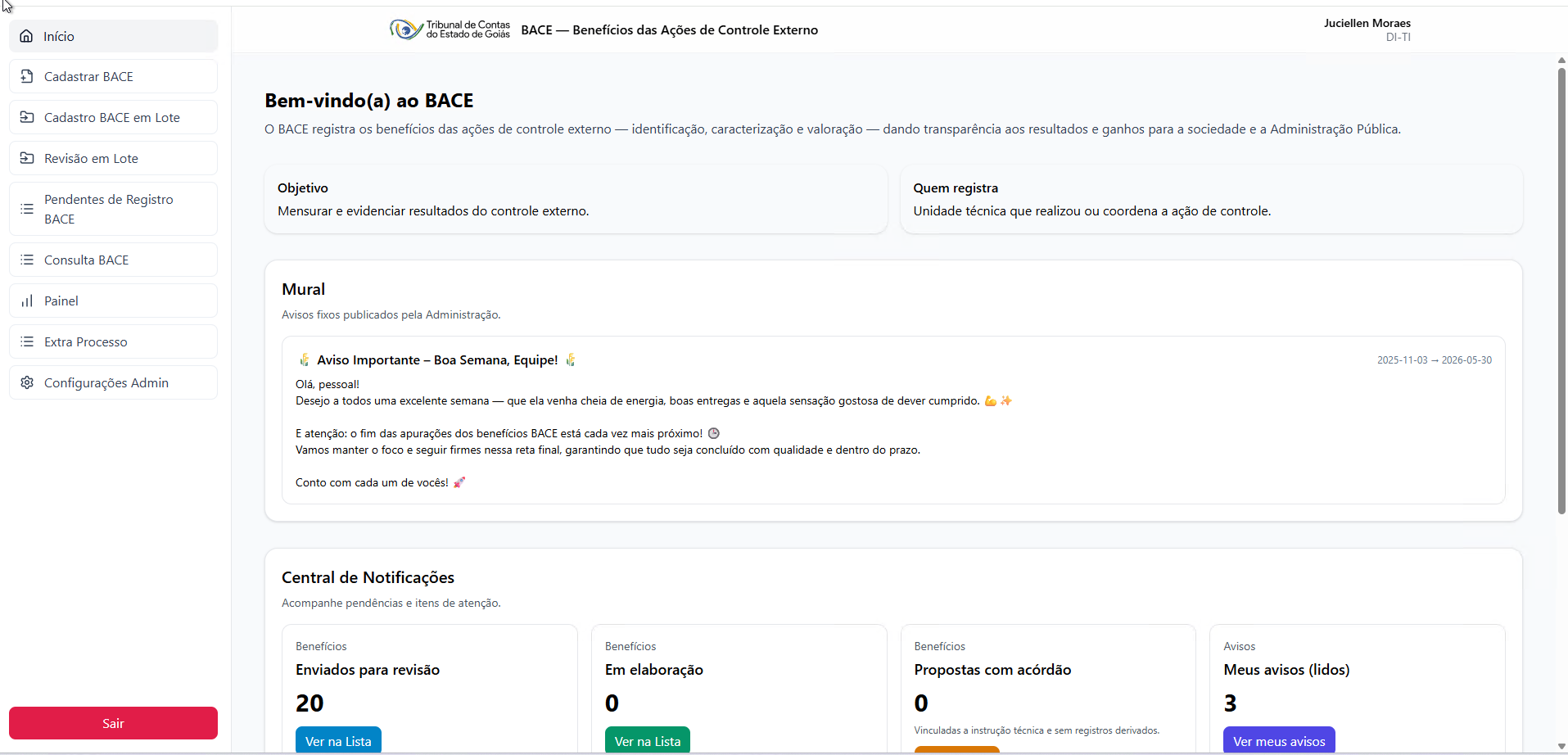 | Notificação: “Em Elaboração” | Indicador / Link | Não | Número de benefícios em elaboração do auditor logado | — | Visível para Coordenador , Supervisor e Administrador; redireciona para Consulta BACE filtrando setor, usuário e situação = Em Elaboração. |