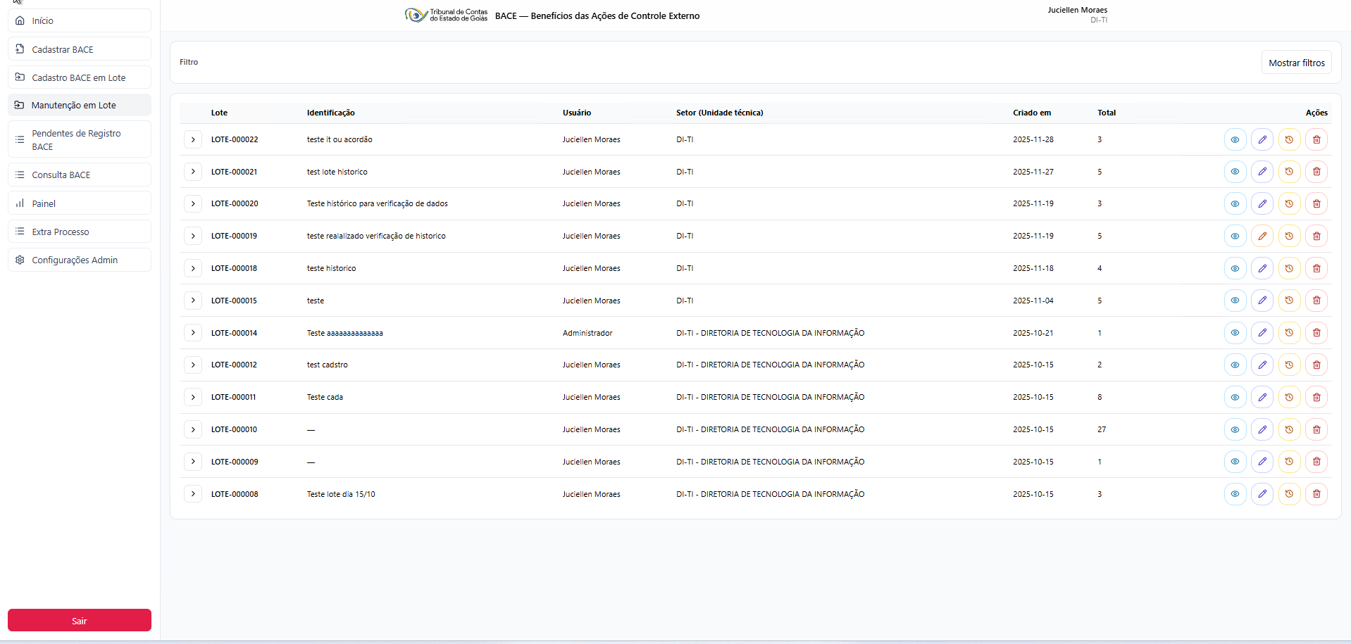 Listar todos os lotes criados pela unidade técnica ou por usuários específicos