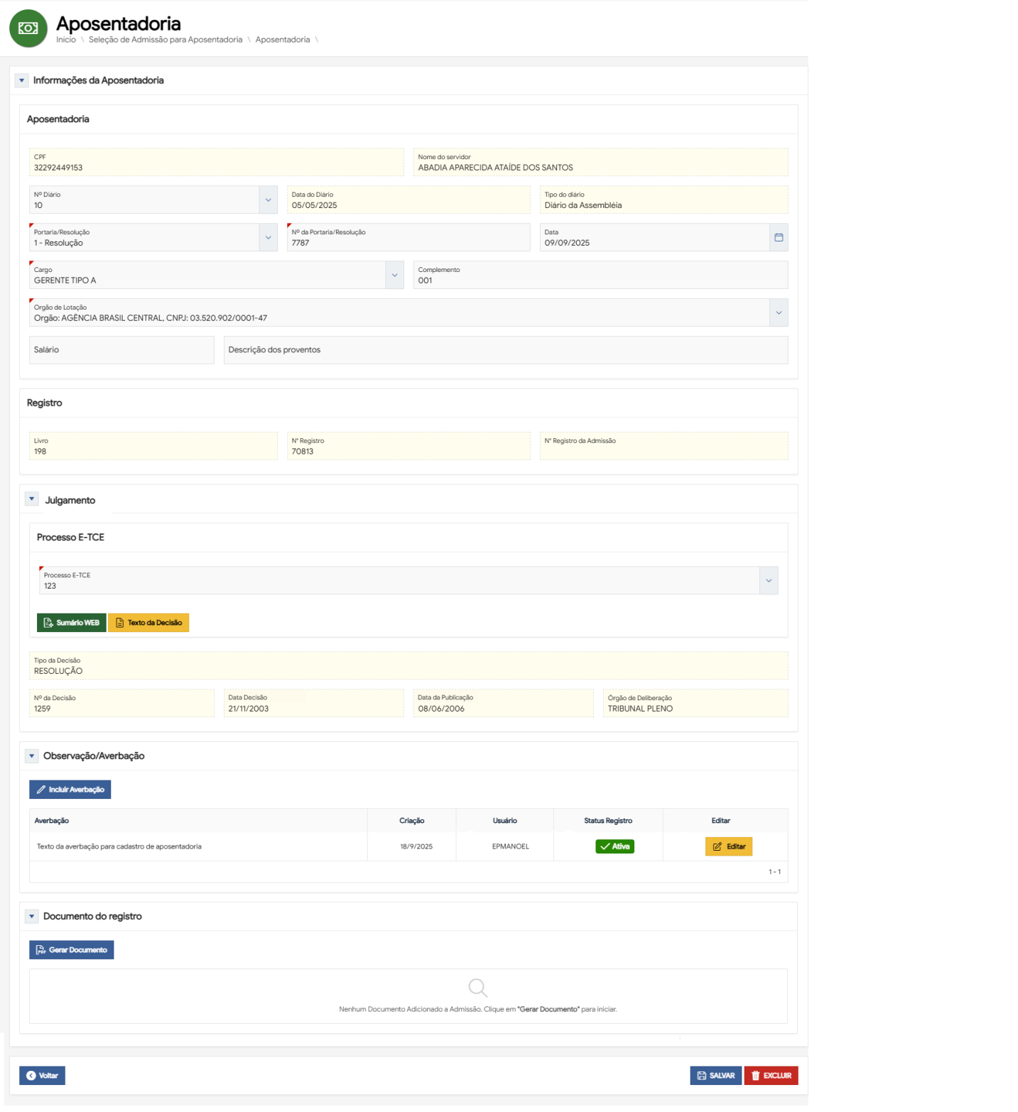 Registro nºAlfanumérico Não- Será gerado automaticamente ao cadastrar aposentadoria. Ou seja, o número será exibido apenas na edição do registro. Número do registro.