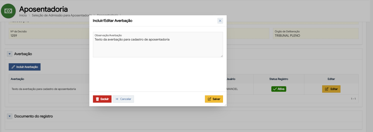 01O usuário Chefe do Serviço de Registro acessa a tela de edição do registro de aposentadoria legado e clica no botão de 'Excluir'. Tela 07