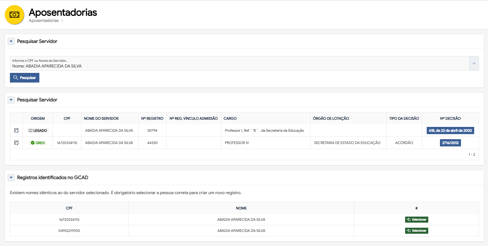 Registros identificados no GCADTabela Exibe todos os registros de aposentadoria encontrados no sistema GREG e todos os nomes idênticos ao servidor pesquisado, existentes no GCAD, organizados nas colunas CPF e Nome.