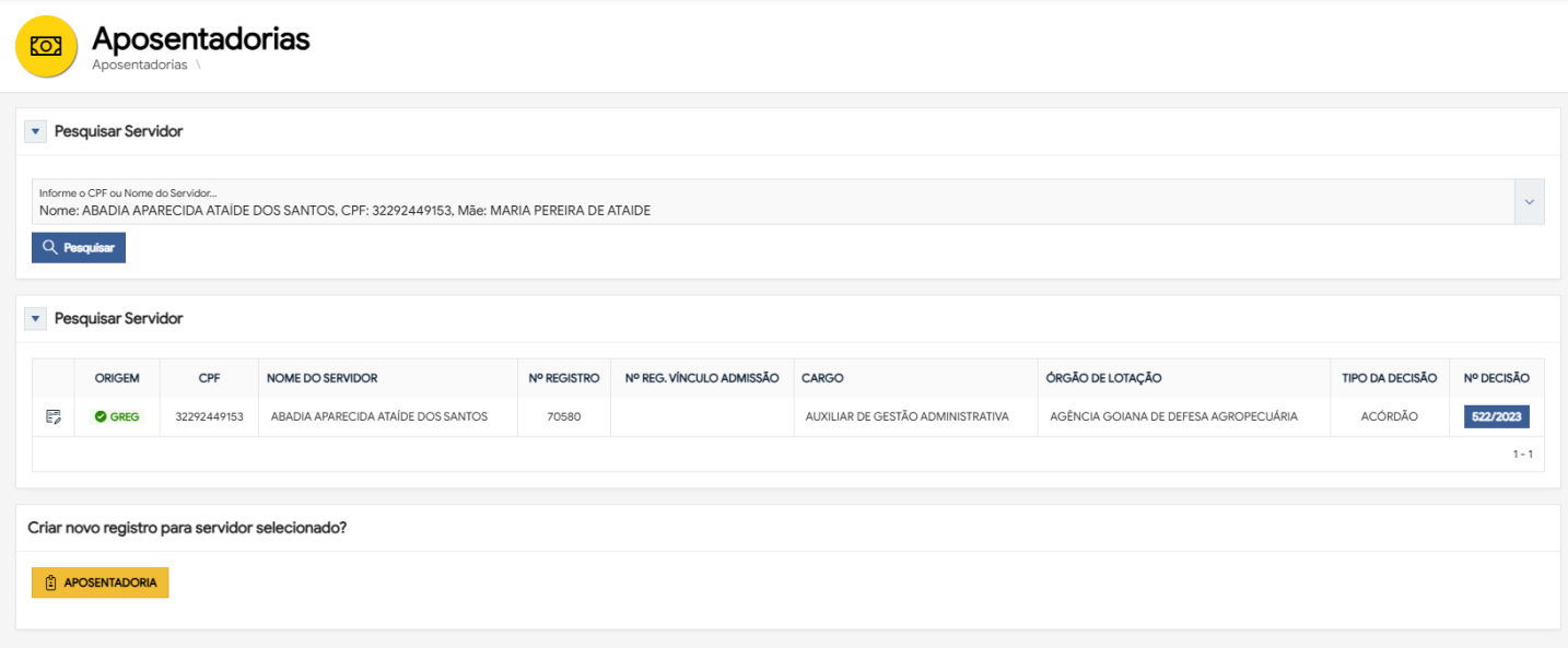 O cadastro de aposentadoria servidor do sistema GREG, permite encontrar registros de servidores por nome, CPF ou ambos. Ao pesquisar, você pode ver aposentadorias já cadastradas no GREG (atuais e legados) e a possibilidade de iniciar o cadastro de um registro de aposentadoria.