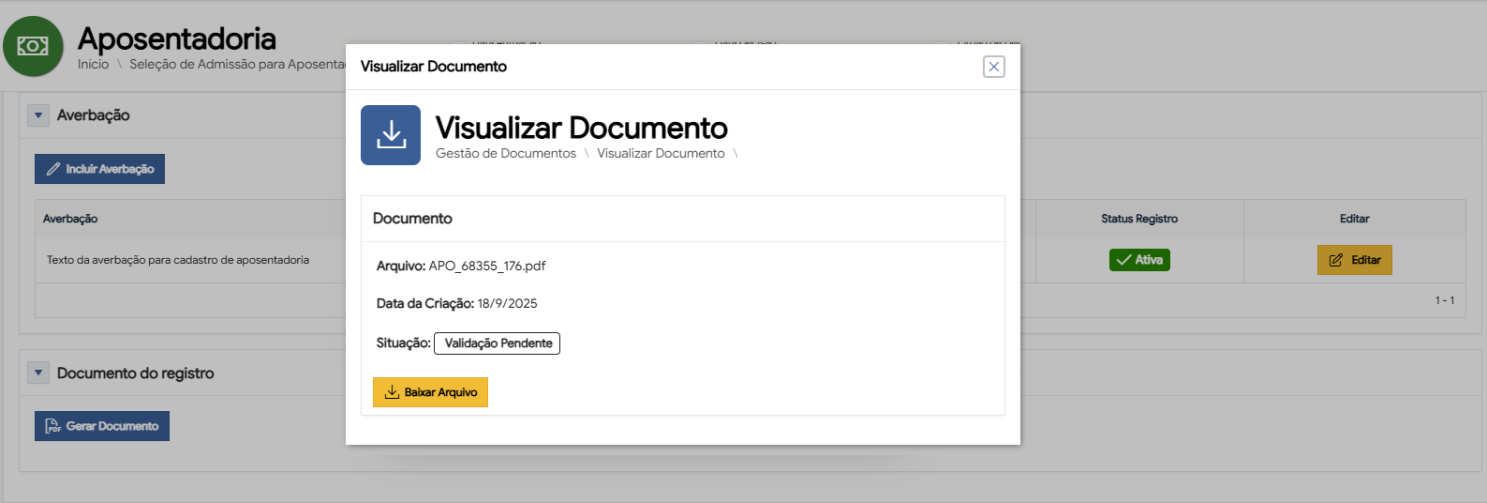 04O sistema abre uma modal com informações do documento e um botão para 'Baixar arquivo'.RN14Tela 06