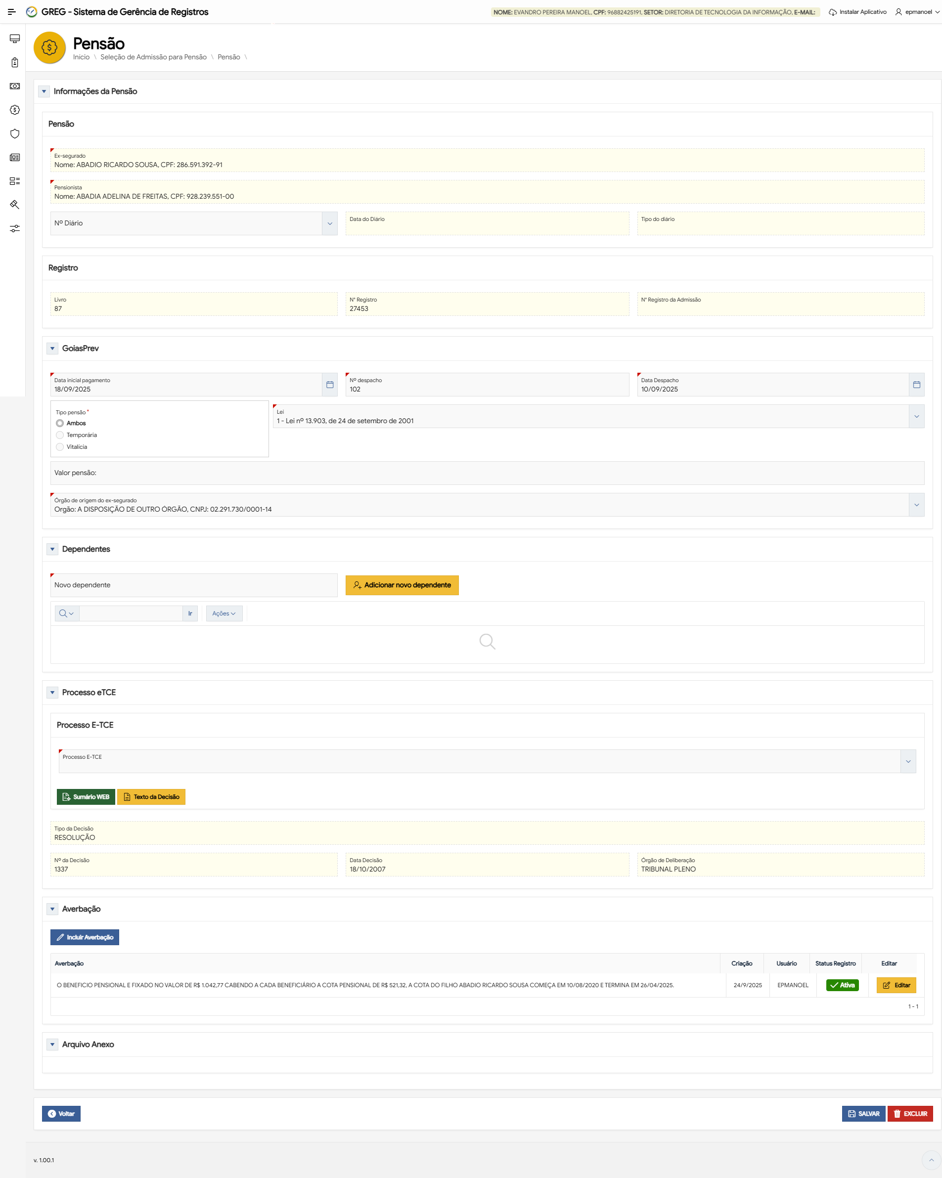 | 004 | O Sistema exibe as seções 'Pensão', 'Registro' e 'Processo eTCE'. | Tela 04 | |