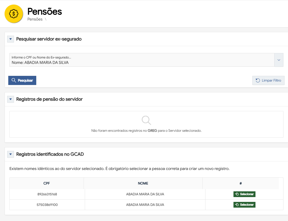 | Registros identificados no GCAD | Tabela | Exibe todos os registros de pensão encontrados no sistema GREG e todos os nomes idênticos ao ex-segurado pesquisado, existentes no GCAD, organizados nas colunas CPF e Nome. | |||