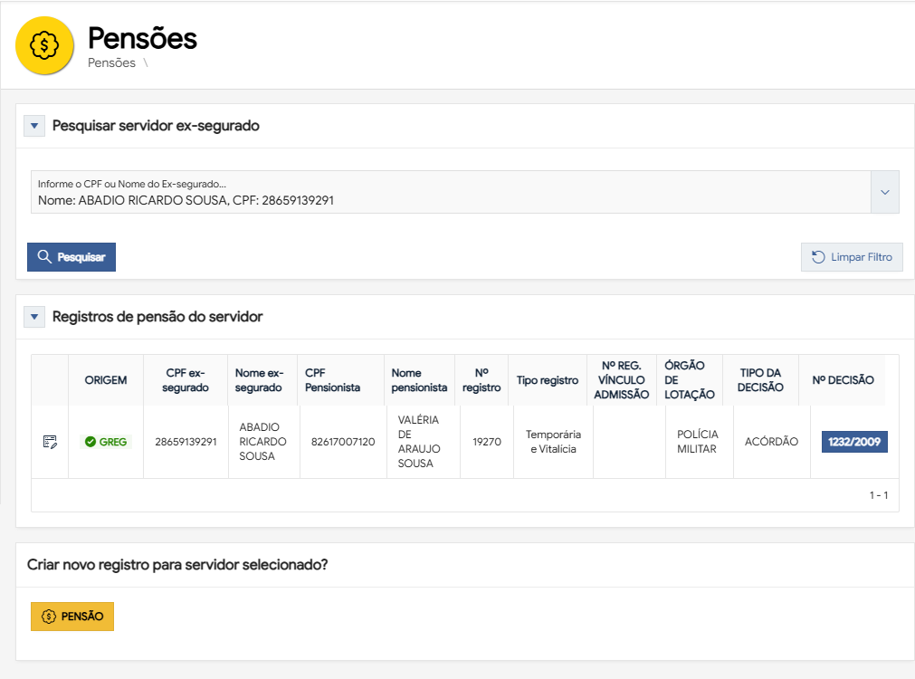 | Registros do Ex-Segurado | Tabela | Exibe os registros de pensão dos beneficiários do GREG e Legados encontrados para o ex-segurado pesquisado, apresentando informações organizadas nas colunas: Origem (LEGADO, GREG), CPF Ex-Segurado, Nome Ex-Segurado, CPF Ex-Segurado, CPF Pensionista, Nome Pensionista, Nº Registro, Tipo Registro, Nº Reg. Vínculo Admissão, Cargo, Órgão de Lotação, Tipo da Decisão e Nº Decisão. | |||
