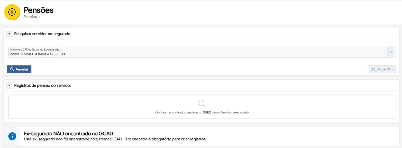 O cadastro de pensão de benefíciáios do ex-servidor no sistema GREG, permite encontrar registros de ex-servidores por nome, CPF ou ambos. Ao pesquisar, você pode ver pensões já cadastradas no GREG (atuais e legados) e a possibilidade de iniciar o cadastro de um registro de pensão.