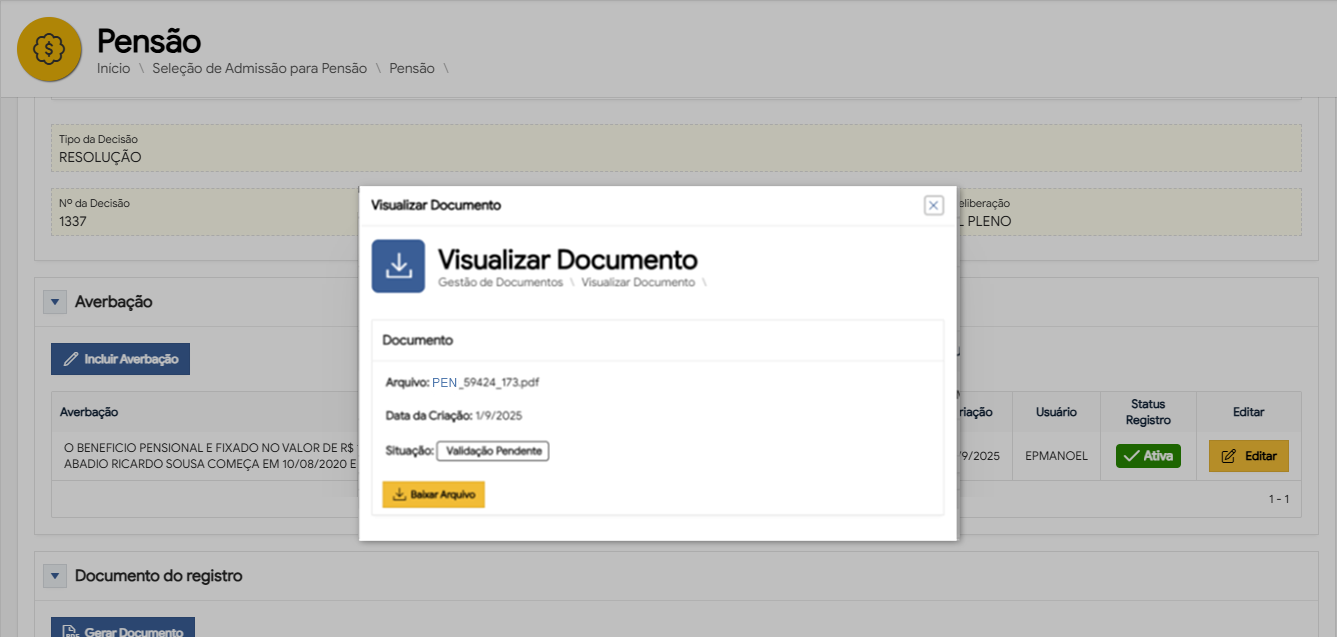| Criar Registro | Botão | Possibilita criar registros de Pensão. | |||