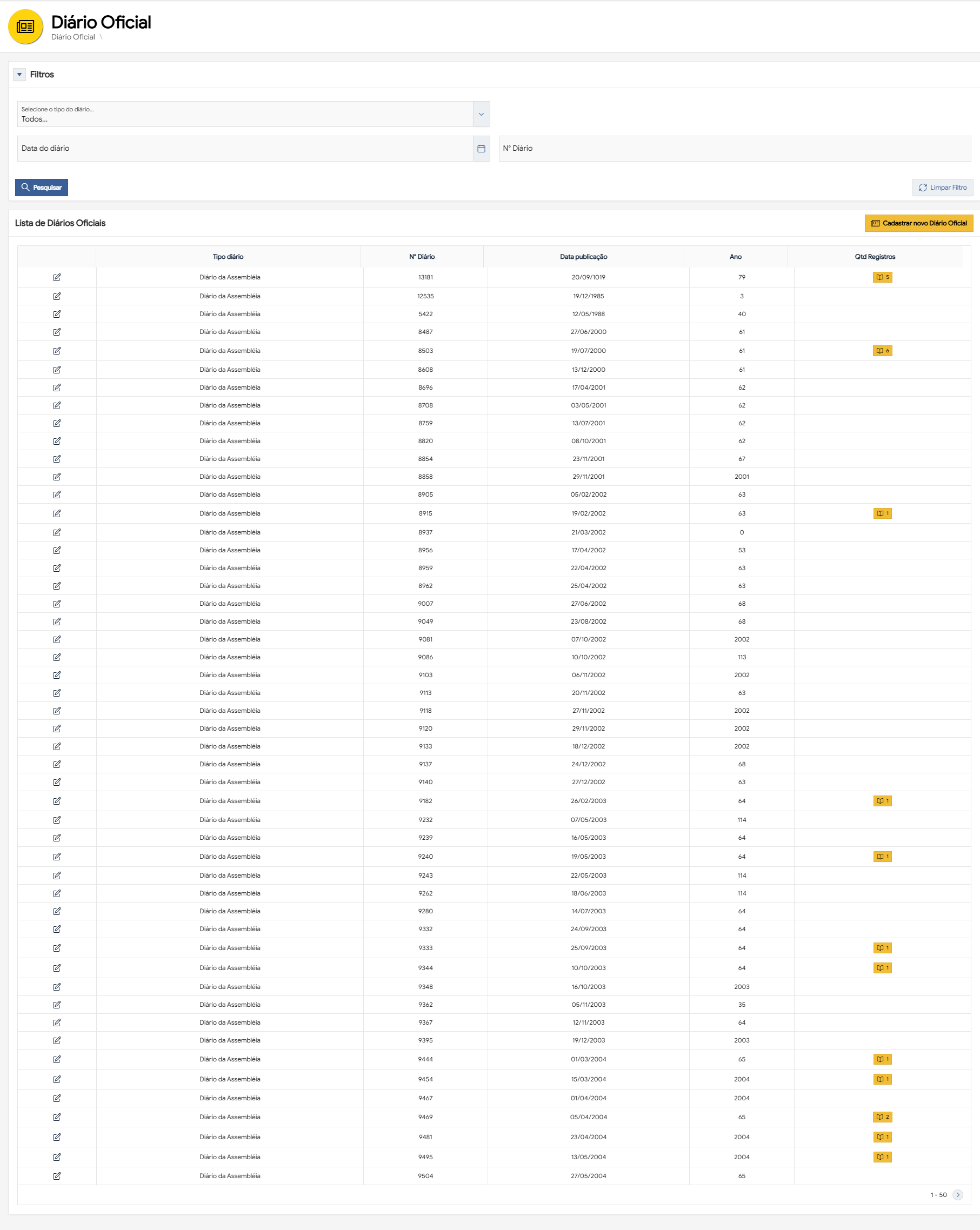 | Lista de diários oficiais | Tabela | Exibe todos os registros GREG e Legados encontrados para os critérios informados na pesquisa, apresentando informações organizadas nas colunas: Tipo diário, Nº diário, Data de publicação, Ano, Qtde de registros. | |||