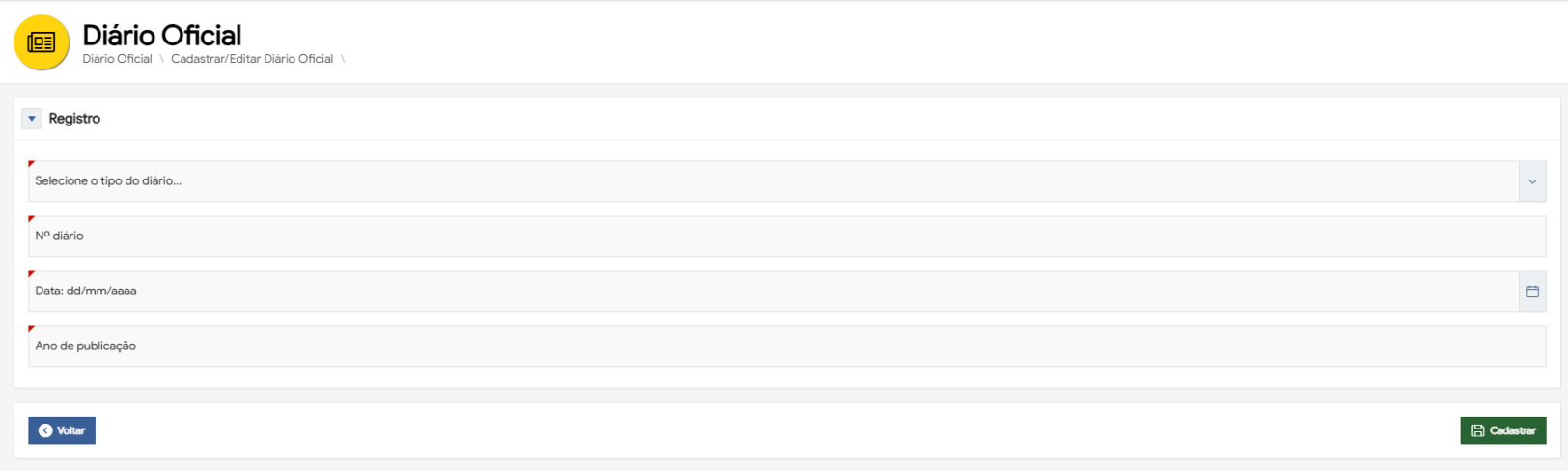 | Cadastrar | Botão | Cadastra o diário oficial no banco de dados. |