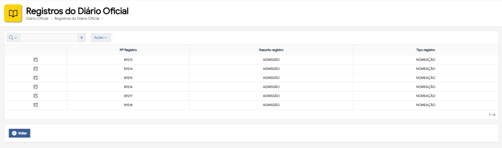 | 02 | O sistema abre a tela de '' Registros do Diário Oficial', com a lista de registros e uma ação (na primeira coluna) que possibilitar consultar/editar o registro, conforme privilégios do perfi de cada usuário. | Tela 02 |