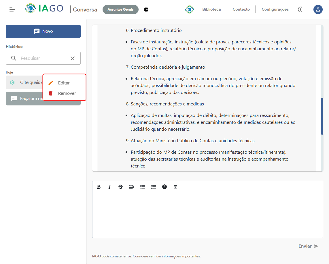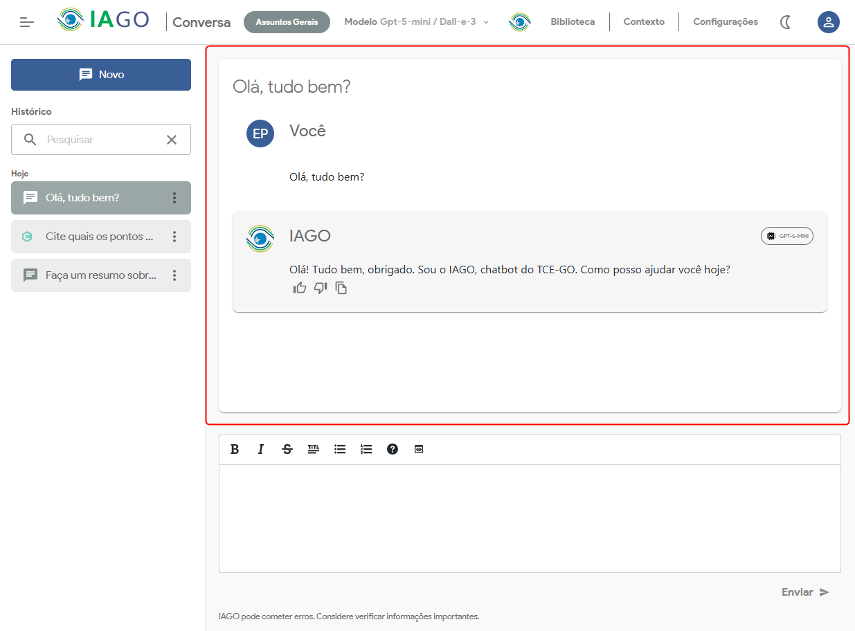 | Botão Enviar mensagem | Botão | Envia o conteúdo digitado no editor para processamento pelo IAGO, registrando a interação no histórico. |