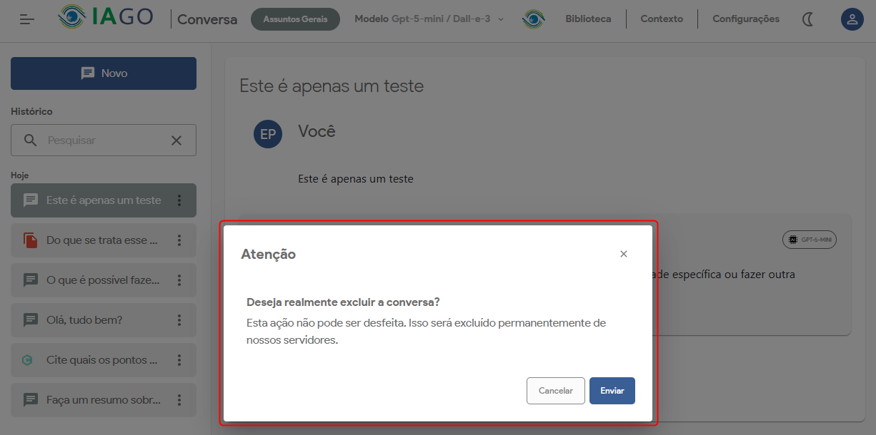 | Enviar | Botão | Realiza a ação. Confirma e remove a conversa do histórico. |