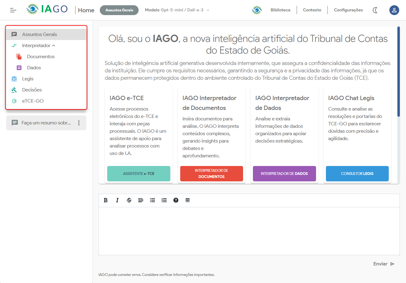 | Tipos de conversa disponíveis | Lista | Assuntos Gerais, interpretador Documentos, interpretador Dados, Legis, Decisões e eTCE-GO. | Exibe a lista de tipos de conversa para seleção, permitindo ao usuário escolher o tipo de assistente ou funcionalidade específica para iniciar uma nova interação (ex: Assuntos Gerais, Legis…). |