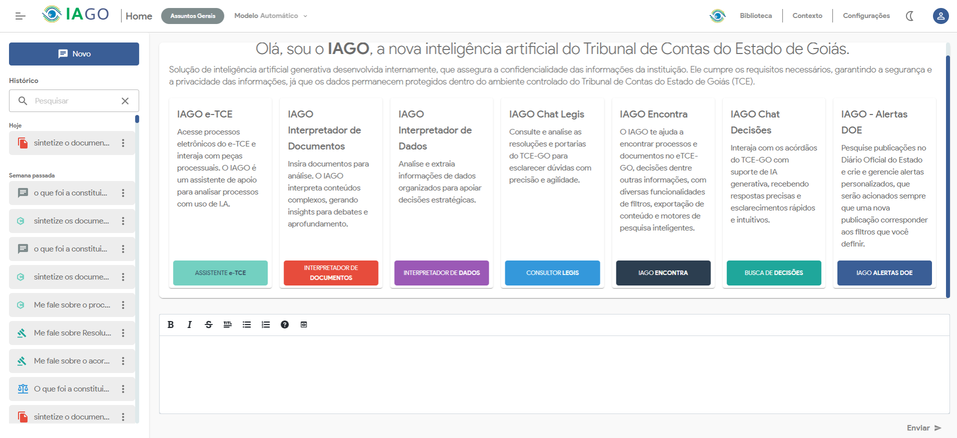 A tela inicial do IAGO é o dashboard principal do ecossistema de inteligência artificial do Tribunal de Contas do Estado de Goiás (TCE-GO). Ela serve como ponto de entrada centralizado após login, oferecendo acesso intuitivo e otimizado às funcionalidades inteligentes que apoiam os servidores em suas rotinas institucionais.