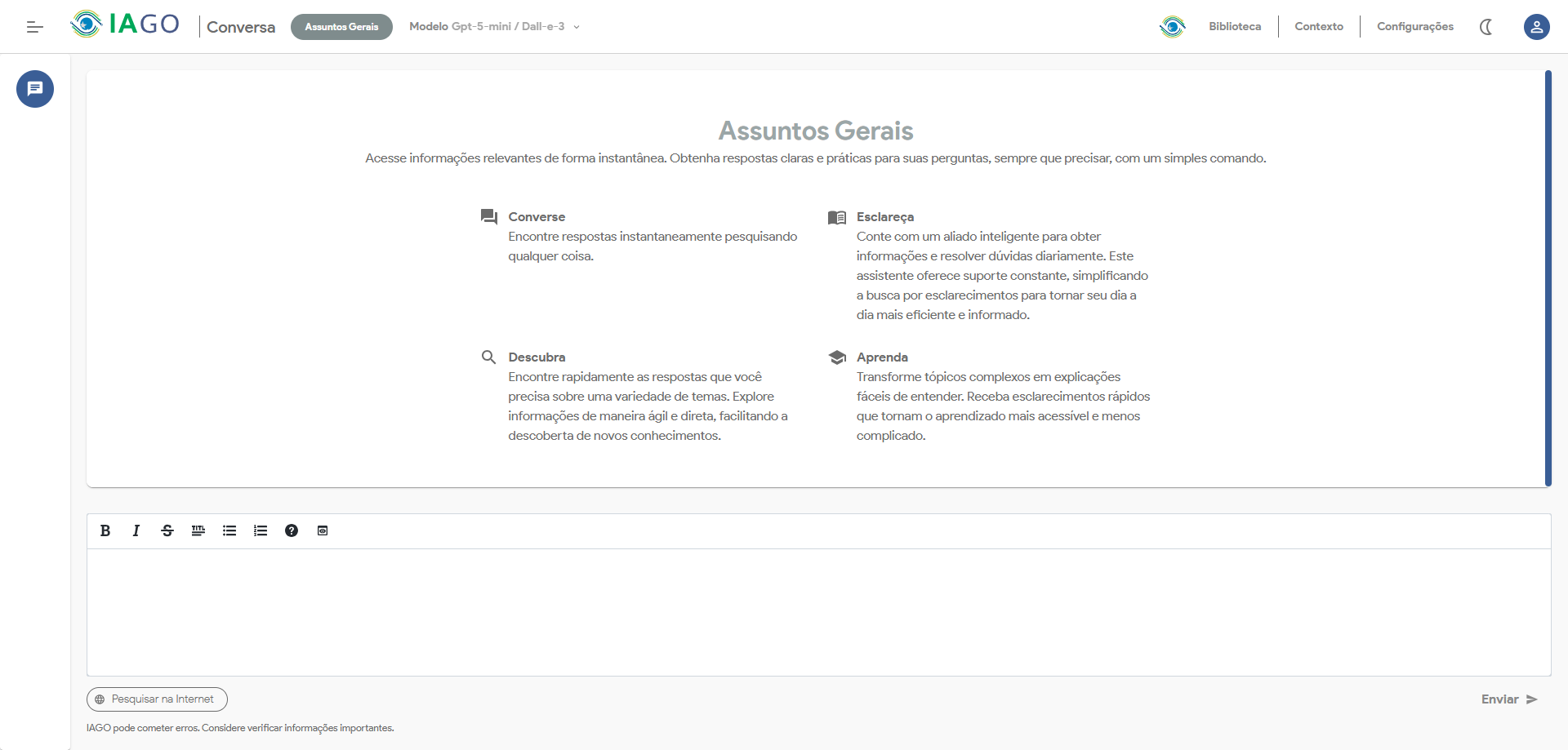 | Enviar | Botão | Envia o conteúdo digitado no editor para processamento pelo IAGO, iniciando a conversa. |
