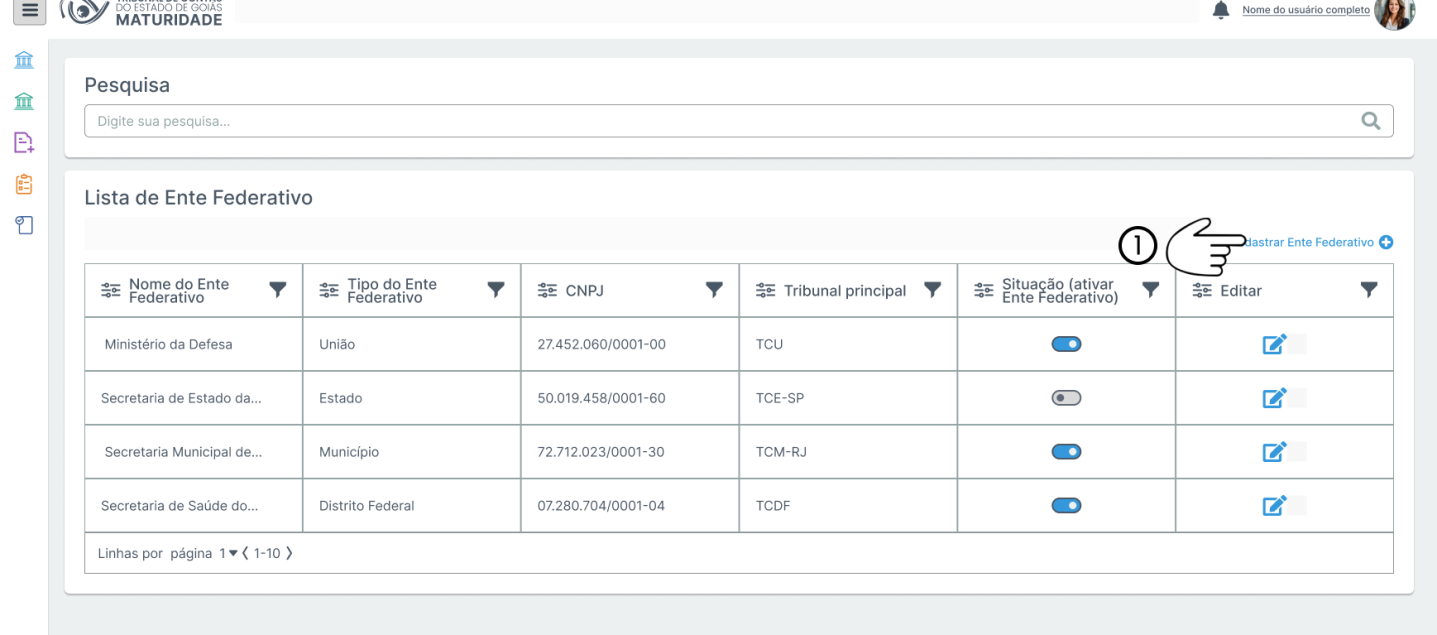 | Cadastrar | Botão | Botão para confirmar o cadastro das informações do novo ente federativo. | ||||