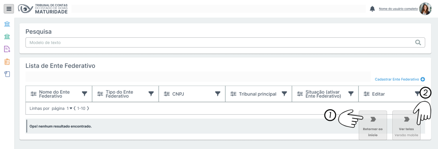 | Lista de Entes federativos(Não encontradas na pesquisa) | Mensagem | Mensagem informativa quando não houver resultados que atendam a pesquisa. |