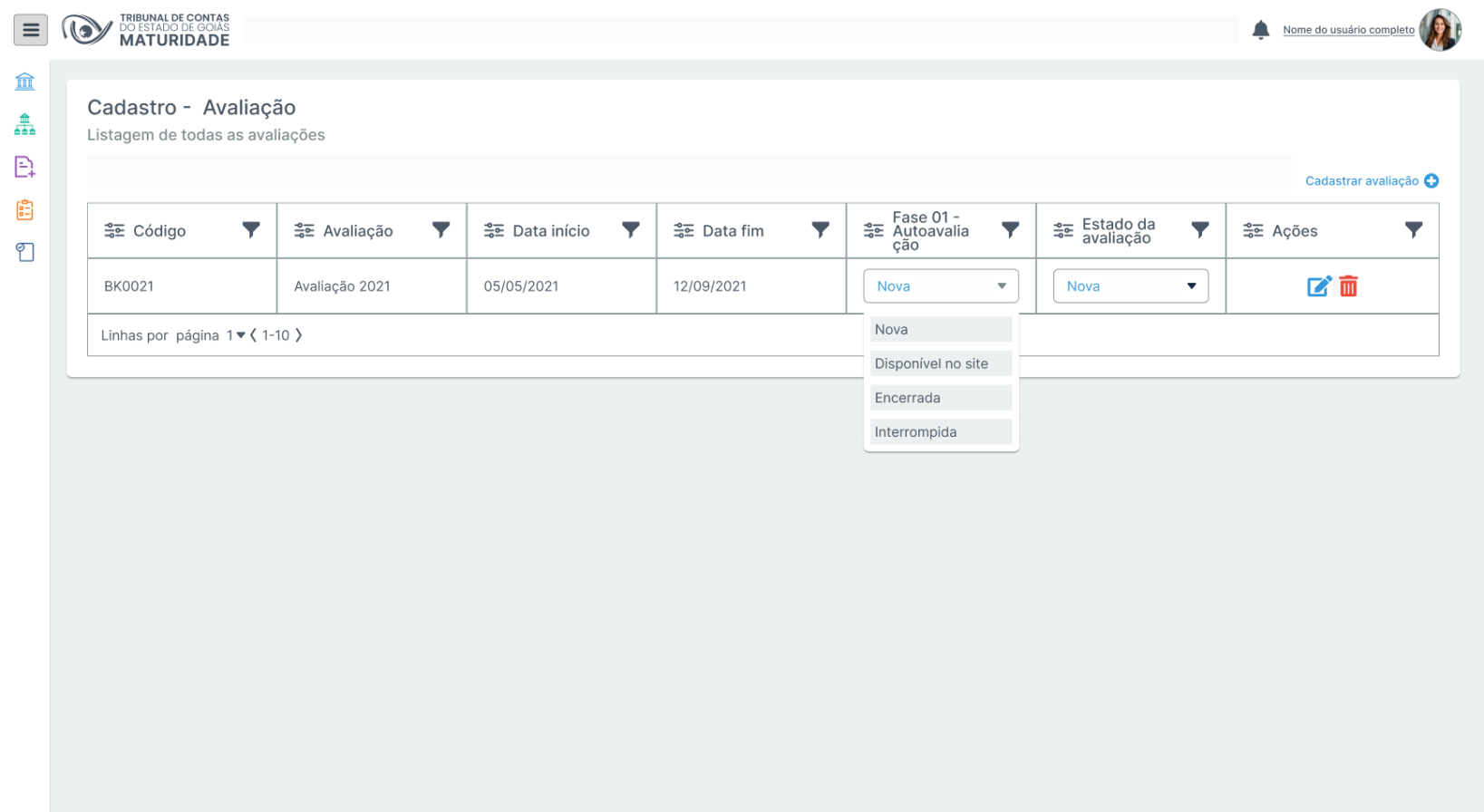 | Lista de Avaliações | Tabela | Exibe a 'Lista de Avaliações', com as seguintes colunas: Código, Avaliação, Data Início, Data Fim, Fase 01 - Autoavaliação, Estado da avaliação, Ações. | |||