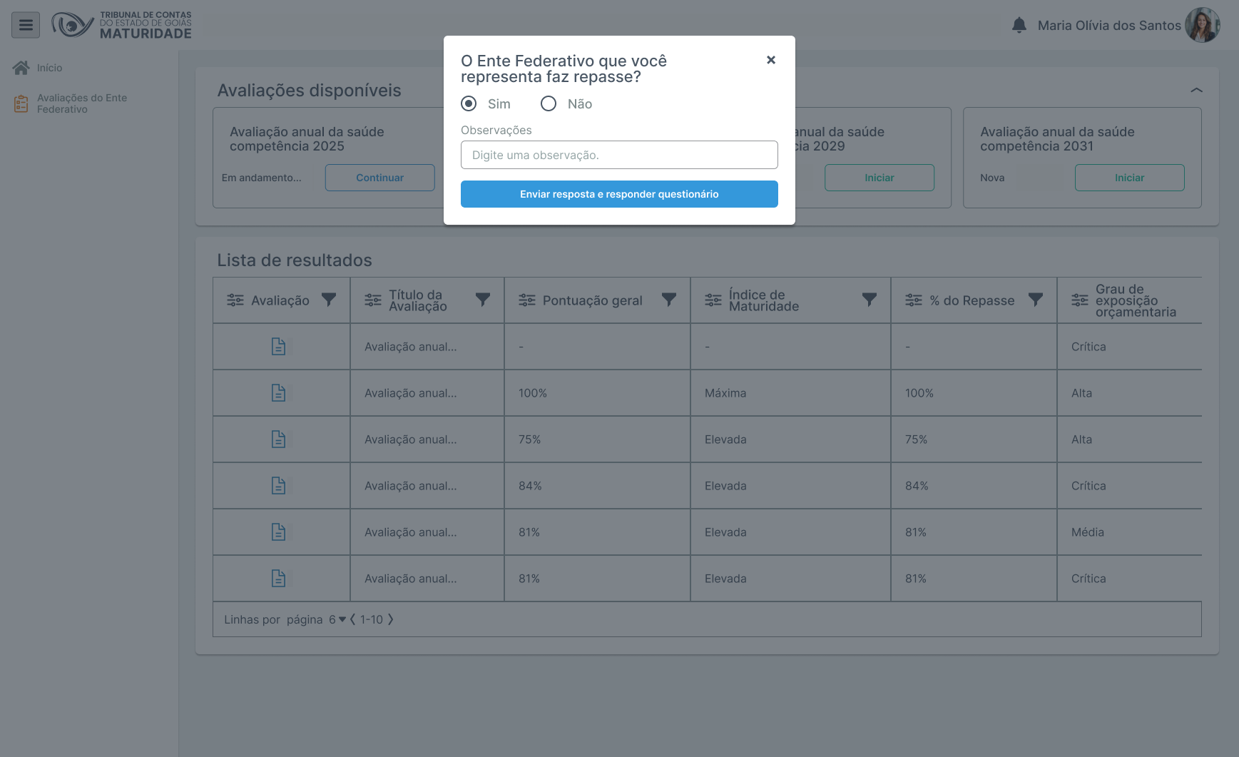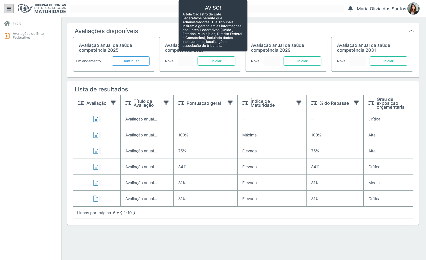 | 01 | O usuário representante do ente federado na tela inicial clicar para “Iniciar” avaliação desejada. | ||