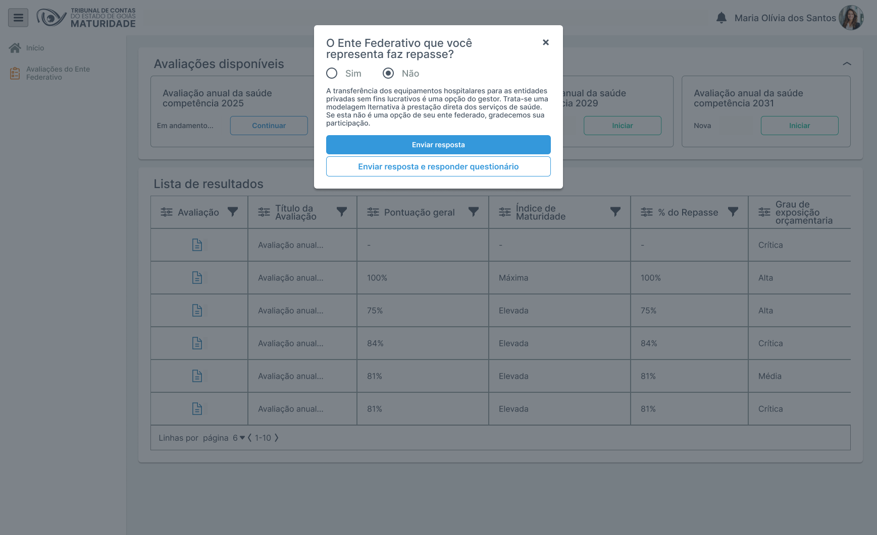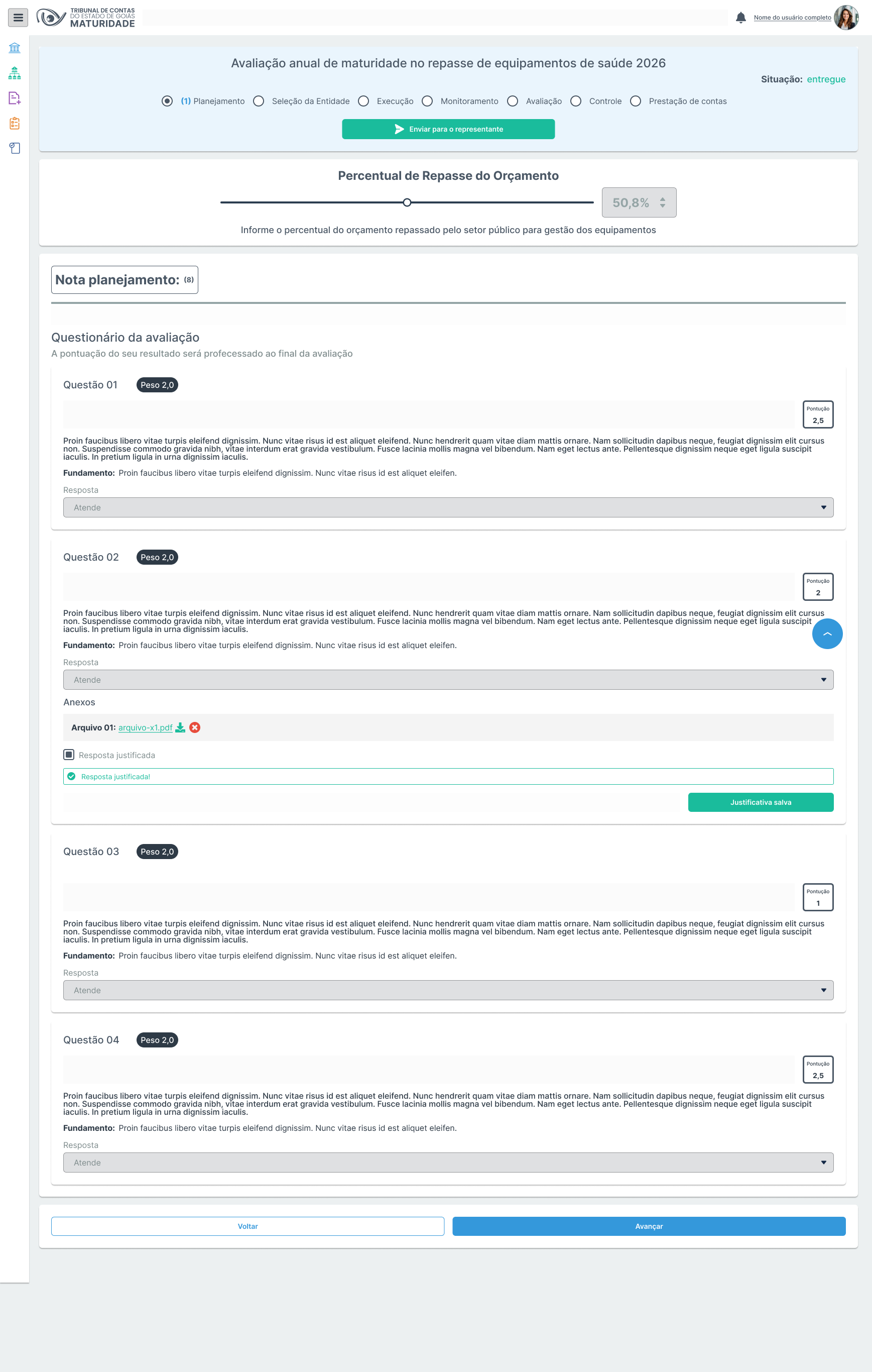 | RN10 | Na avaliação em andamento, o campo Percentual de repasse do orçamento deve mostrar o valor informado pelo representante do ente federativo, com possibilidade de edição. |
