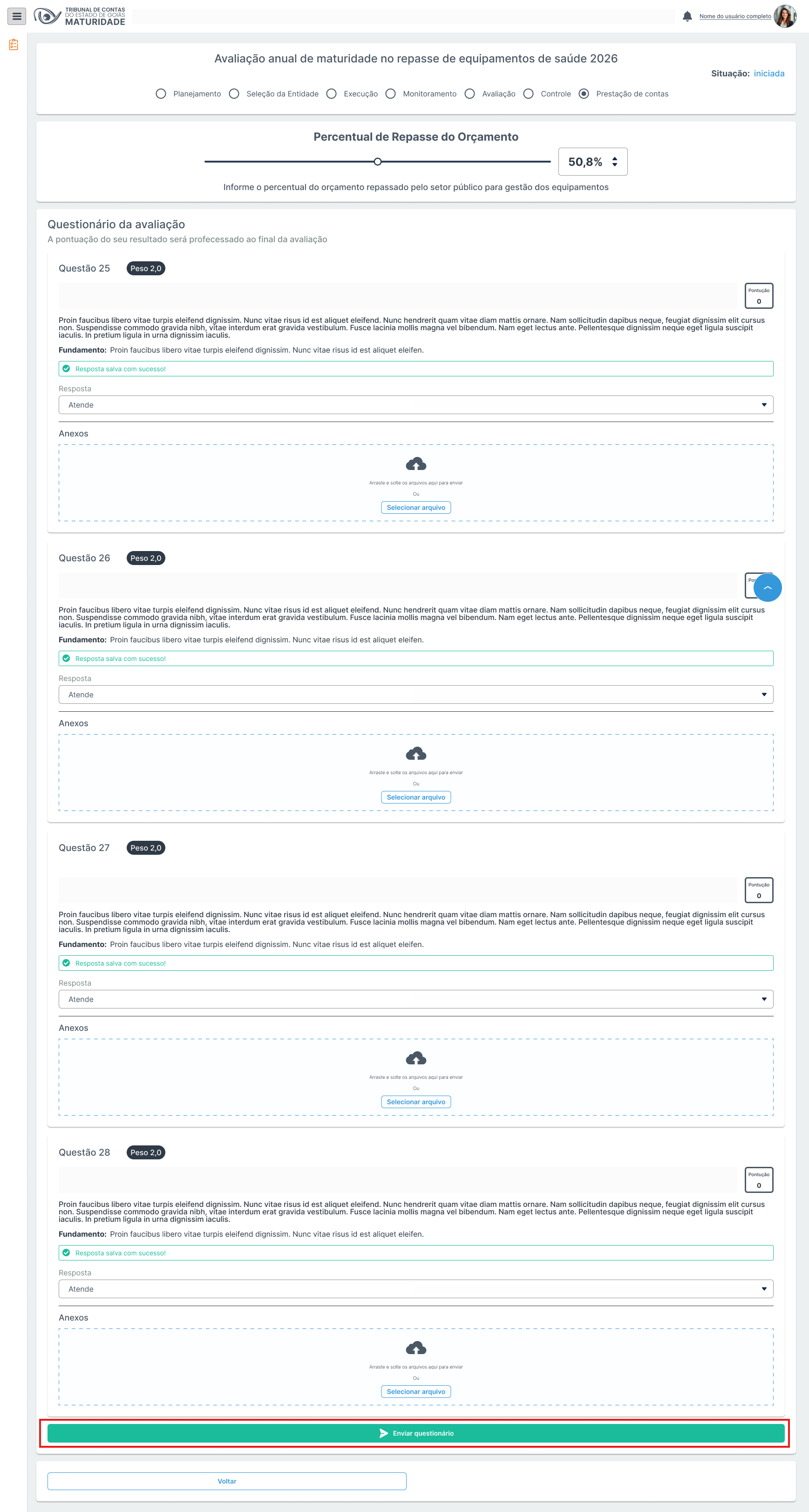 | 02 | O sistema verifica se todas as questões foram respondidas e se os anexos obrigatórios foram inseridos conforme esperado. Se a verificação for bem-sucedida, exibe uma tela de confirmação do envio para revisão com duas opções 'Cancelar' e 'Enviar'. Se confirmado o envio, calcula as pontuações individuais de cada questão, o total (Σ) geral das notas por macroprocesso, altera a situação para 'Entregue', exibe uma mensagem de sucesso e disponibiza o questionário para revisão do tribunal responsável. | RN02, RN04, RN05, RN06, RN08, RN09 | Tela 03 |