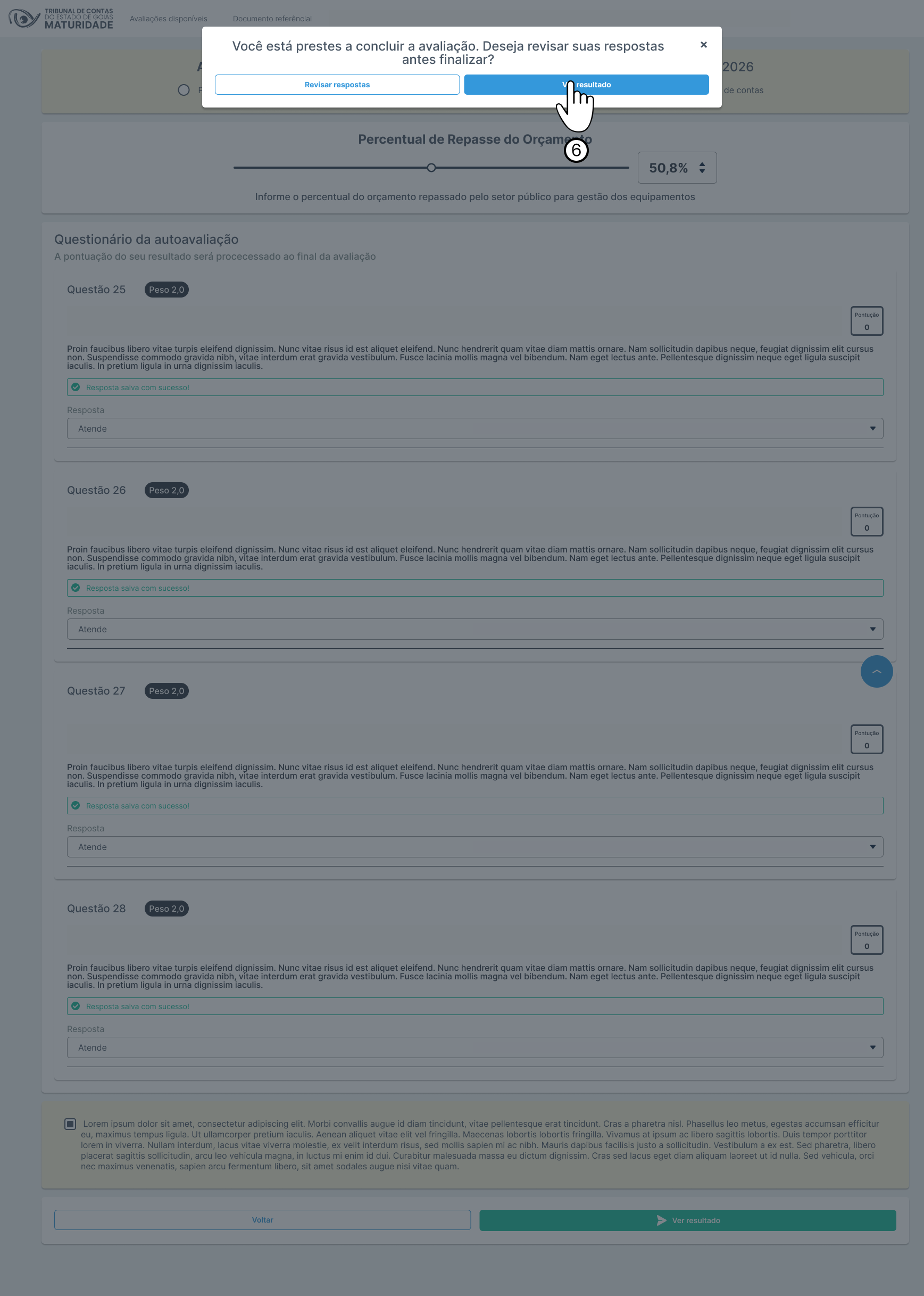 | Ver resultado | Botão | Ao clicar, permite confirma a conclusão da autoavaliação e redireciona o usuário para visualizar os resultados finais, incluindo pontuação, análises e conclusões do processo avaliativo. |