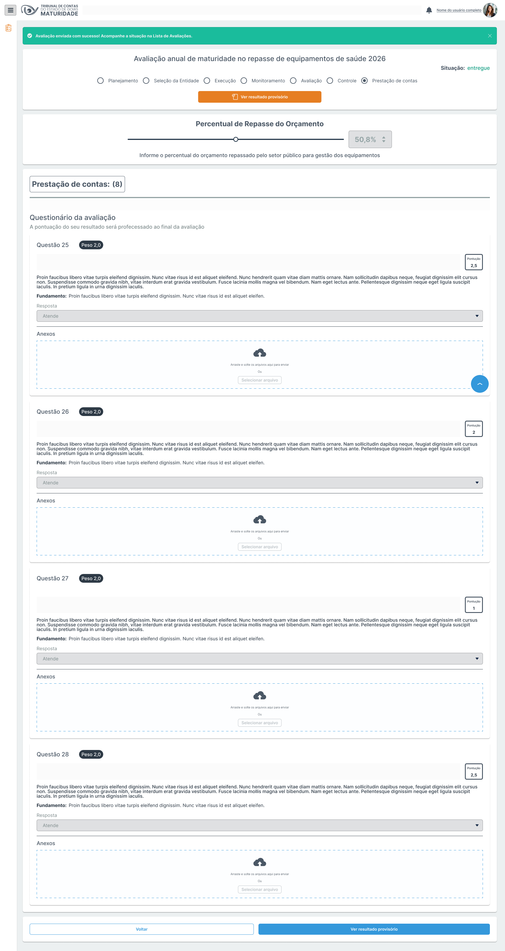 Repasse OrçamentárioCard Exibe o percentual de orçamento repassado informado pelo usuário durante a autoavaliação (ex.: “Valor do repasse: 50,8%”).