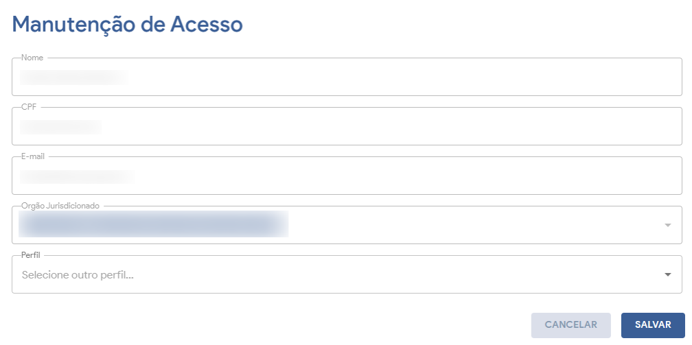 03Usuário confere os dados do usuário para o qual está fornecendo acesso, preenche os campos “Órgão Jurisdicionado” e “Perfil” e clica no botão “Salvar”. Tela 03