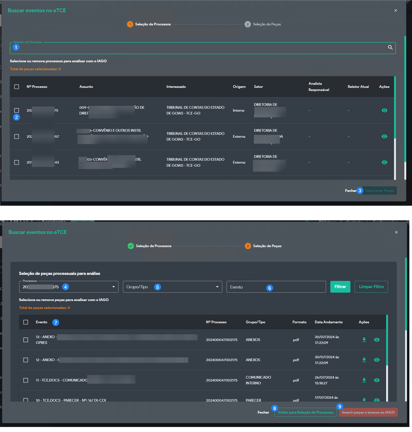 Nota: Se um processo for reservado ou contiver documento de decisão inacessível no eTCE para o seu perfil/setor, ele também não poderá ser utilizado no IAGO–eTCE.