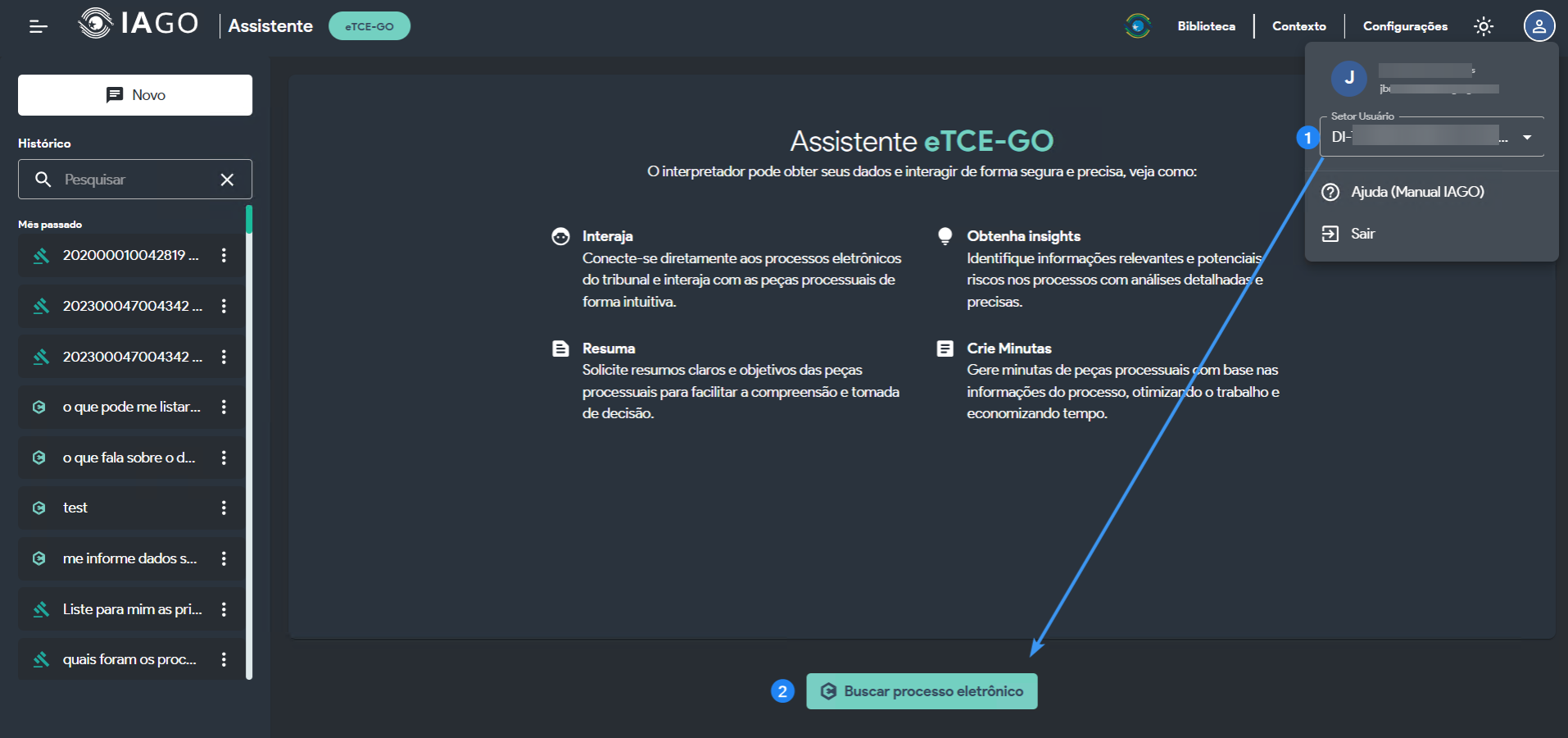 O IAGO – eTCE-GO é um interpretador inteligente que obtém dados dos processos eletrônicos do Tribunal e permite interações de forma segura e precisa. Ele ajuda você a: