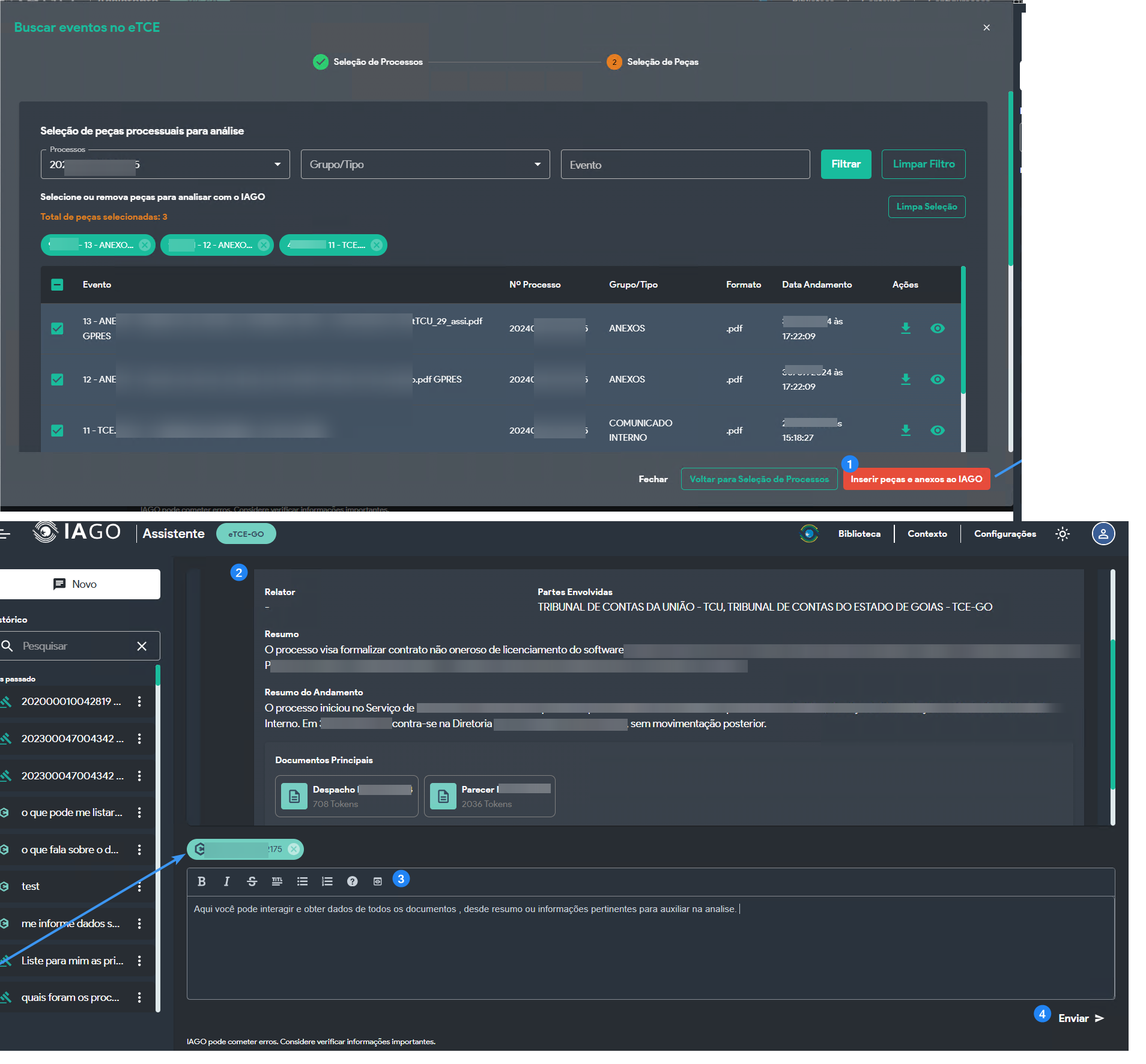 Se necessário, adicione anexos para complementar Clique em “Inserir peças e anexos no IAGO”. O sistema realiza a validação de tokens (600.000,00). Em caso de excesso, reduza a seleção e tente novamente. Interagir com o processo O painel apresenta resumo automático (partes, relator, andamento, documentos principais). Use o campo de interação para: Resumir peças; Extrair dados objetivos (nomes, datas, valores, referências legais); Obter insights (riscos, inconsistências, lacunas); Gerar minutas (despachos, pareceres, ofícios, comunicações). Se você mudar a lista de processos durante a sessão, o IAGO atualiza o resumo automaticamente. ==== Segurança e Sigilo ==== Ao um processo ser classificado como SIGILOSO, o IAGO apaga fisicamente todas as conversas e históricos vinculados àquele processo no assistente. Essa medida reforça o cumprimento das normas de acesso e das obrigações legais (incluindo LGPD). O IAGO não amplia permissões: ele segue exatamente o que o eTCE autoriza. ==== Boas Práticas ==== Verifique sua permissão antes de buscar ou abrir processos de outros setores. Priorize documentos finalizados (evite o último andamento). Para análises longas, divida em blocos para não atingir o limite de tokens. Ao gerar minuta, revise juridicamente antes de anexar ao processo oficial. Registre no processo oficial a fonte das informações geradas (peças consultadas, datas e versões).