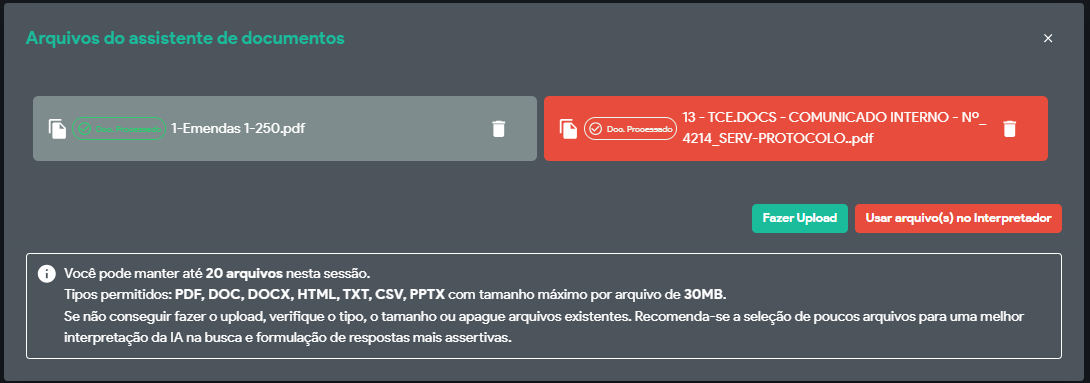 | É permitido manter no máximo 20 arquivos. Verifique a quantidade de documentos já carregados na sessão. | Limite máximo de arquivos atingido | Excluir arquivos antigos antes de enviar novos. |