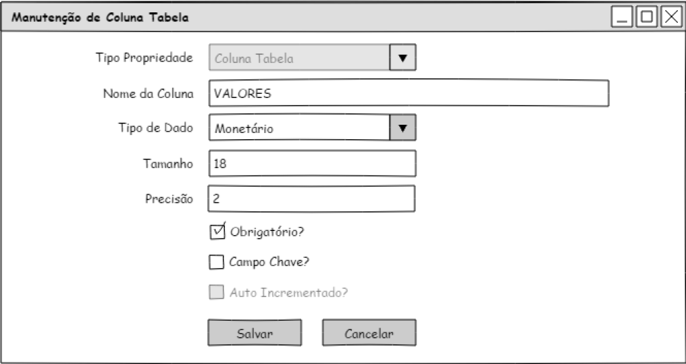 Na grid de Colunas deverá se informado as colunas que compõem a tabela. Dessa forma será apresentada a opção de incluir uma nova coluna, que será apresentada a funcionalidade de Manutenção de Coluna Tabela. Nessa rotina serão apresentados os campos Tipo Propriedade (por default será apresentado Coluna Tabela), o campo Nome da Coluna (campo único para a tabela, que deverá conter no máximo 30 (trinta) caracteres, o campo Tipo de Dado (podendo ser Número, Monetário - que apresentará a precisão do campo, Texto, Data, Data e Hora, Hora e Arquivo), o campo Tamanho (que deverá ser informado o tamanho do campo para os Tipos de Dado Número, Monetário e Texto), o campo Precisão (que será apresentado quando o Tipo do Dado for Monetário) e por fim a opção que determina se a coluna é de preenchimento obrigatório ou não. Para determinar qual(ais) coluna(s) será(ão) a(s) chave(s) de identificação do registro no destino, o usuário deverá marcar a opção Campo Chave. Já para determinar se o campo é auto incrementado no banco de dados, deverá marcar a opção Auto Incrementado, uma vez esse campo marcado a propriedade de campo obrigatório deixará de ser válida, visto que não poderá ser informado se ele é auto incrementado. Este opção de auto incremento só estará disponível para os campos do tipo de dado Número.