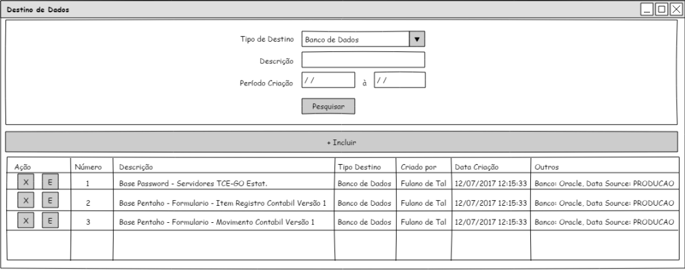 No momento de incluir/atualizar um registro de Destino de Dado, será validada a conexão, se a opção de criar a tabela caso não exista estiver marcado será validado se a tabela de nome informada não existe para então criar, no processo de atualização essa opção não será permitido caso a tabela já exista. Será validado ainda se no nome e nas colunas informadas tem injeção de SQL. No processo de validação caso seja identificada alguma inconsistência será apresentado ao usuário a mensagem com as inconsistências identificadas, caso não seja apresentado inconsistências e o processo for para criar a tabela com as colunas configuradas, o sistema tentará criar a tabela conforme configurado, caso ocorra algum erro inesperado como de privilégios de DDL (Data Definition Laguage) no banco de dados informado, será registrado o Log da exceção e apresentado para usuário o identificador do erro registrado. Na atualização de uma definição de Destino de Dado para incluir, ou alterar ou excluir uma coluna da tabela no banco de dados caso ela já exista e contenha registro só será possível ser feito por um profissional DBA, o sistema não fará tal manipulação por questão de segurança e integridade do banco de dados a ser manipulado.