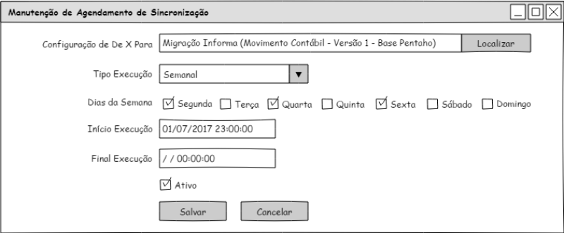Na configuração de agendamento de sincronização o sistema irá validar apenas se existe configuração de agendamento iguais ativos para a mesma configuração de De X Para, não validando dessa forma se terá concorrência de sincronismo agendado com base na configuração. Assim, na execução da sincronização o sistema irá marcar o controle de sincronização quando em execução, de modo que outro agendamento possa identificar e reagendar a execução para adiar em 10 minutos. Nesse sentido, a responsabilidade do controle de sincronizações agendadas será do usuário que configurou, o qual deverá analisar a melhor configuração de agendamento para o que necessita.